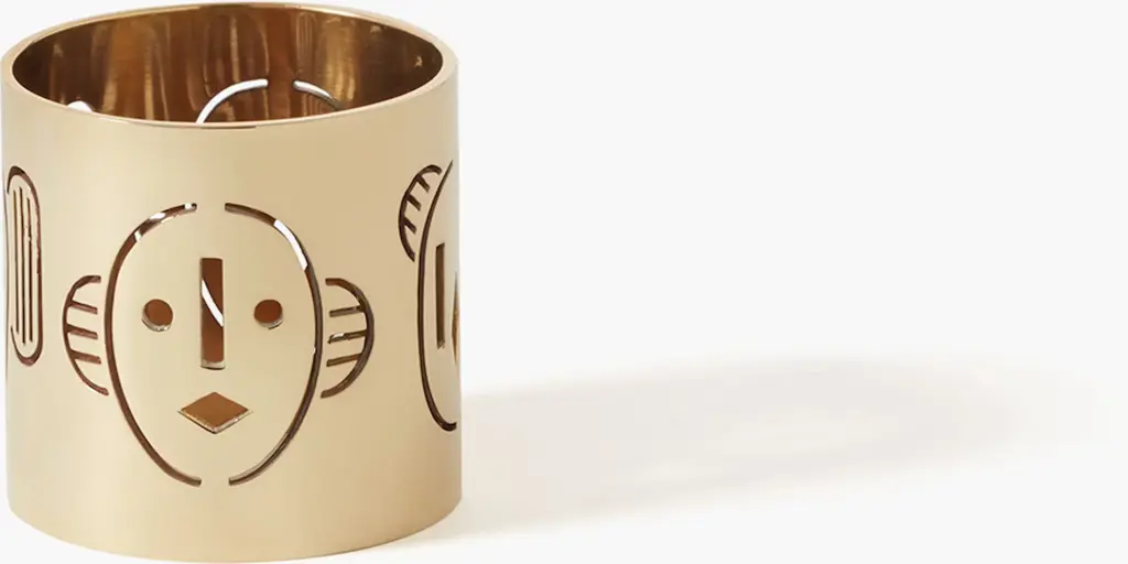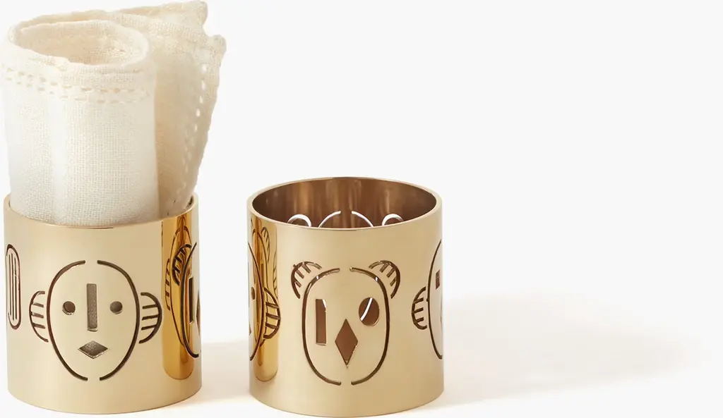 Imaginative faces decorate the Maski Napkin Rings (2019), bringing a sense of whimsy to the table. But you also could say the cartoonish visages, engraved by master artisans, quietly comment on whether we are our true selves in public. Made of solid brass, the circular holders come in a set of two. Part of Jaime Hayon's "Fun-tional Table" collection of tabletop goods. Made in Italy.