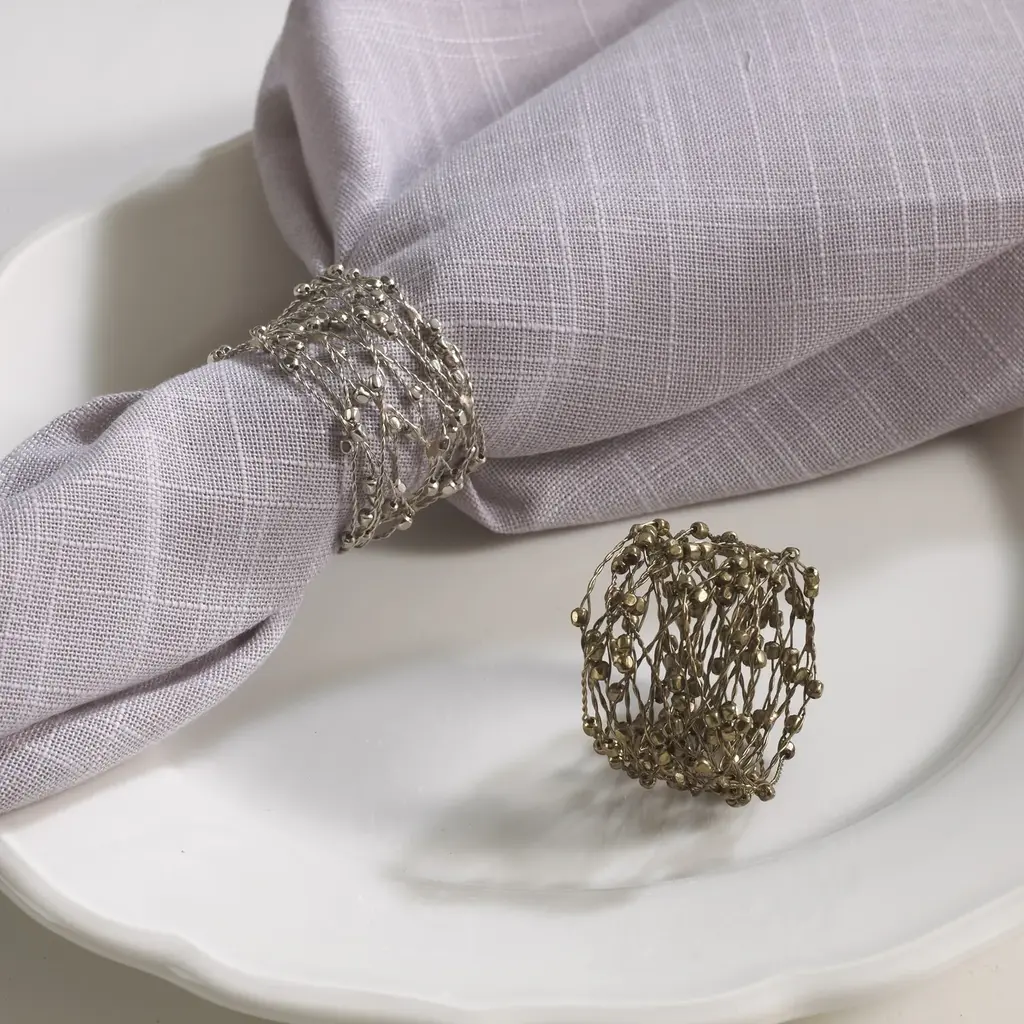 Provide an elegant complement to any event with these metal design napkin rings. These beautiful napkin rings offer up that finishing touch your party needs. An organic, handmade look is imparted through bands of twisted, multilayered wire strung with irregularly shaped metal beads, making them the perfect accompaniment for a rustic-chic table setting to coordinate wonderfully with natural-colored linens. Their metallic surface is perfect for reflecting light from candle centerpieces, creating a magical effect at your dinner party table.