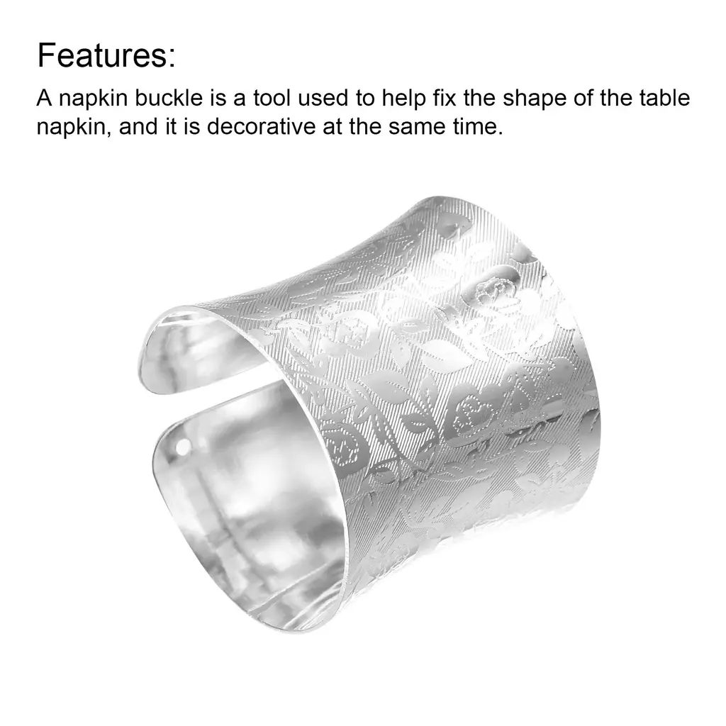 Product Name: Napkin Rings; Material: Alloy; Color: Silver ToneOuter Diameter: 46mm / 1.81"; Inner Diameter: 40mm / 1.57"; Total Height: 40mm / 1.57"; Package Content: 6pcs x Napkin RingsDesign: The napkin ring is made of alloy, good decorative and wear resistance. Decorate a drab napkin to make it look more sophisticated.Features: A napkin buckle is a tool used to help fix the shape of the table napkin, and it is decorative at the same time. It can be used with the napkin, or it can be used alone as a decorative ornament, which can be reused.Application: Napkin ring is widely used in restaurants, reception, parties, cafes, dance parties, and other places, it is a good choice for decorations such as parties, weddings, Easter, Christmas, Thanksgiving, etc.Description:1. Design: The napkin ring is made of alloy, good decorative and wear resistance. Decorate a drab napkin to make it look more sophisticated.2. Features: A napkin buckle is a tool used to help fix the shape of the table napkin, and it is decorative at the same time. It can be used with the napkin, or it can be used alone as a decorative ornament, which can be reused.3. Application: Napkin ring is widely used in restaurants, reception, parties, cafes, dance parties, and other places, it is a good choice for decorations such as parties, weddings, Easter, Christmas, Thanksgiving, etc.Specification:Product Name: Napkin RingsMaterial: AlloyColor: Silver ToneOuter Diameter: 46mm / 1.81"Inner Diameter: 40mm / 1.57"Total Height: 40mm / 1.57"Package Content: 6pcs x Napkin Rings