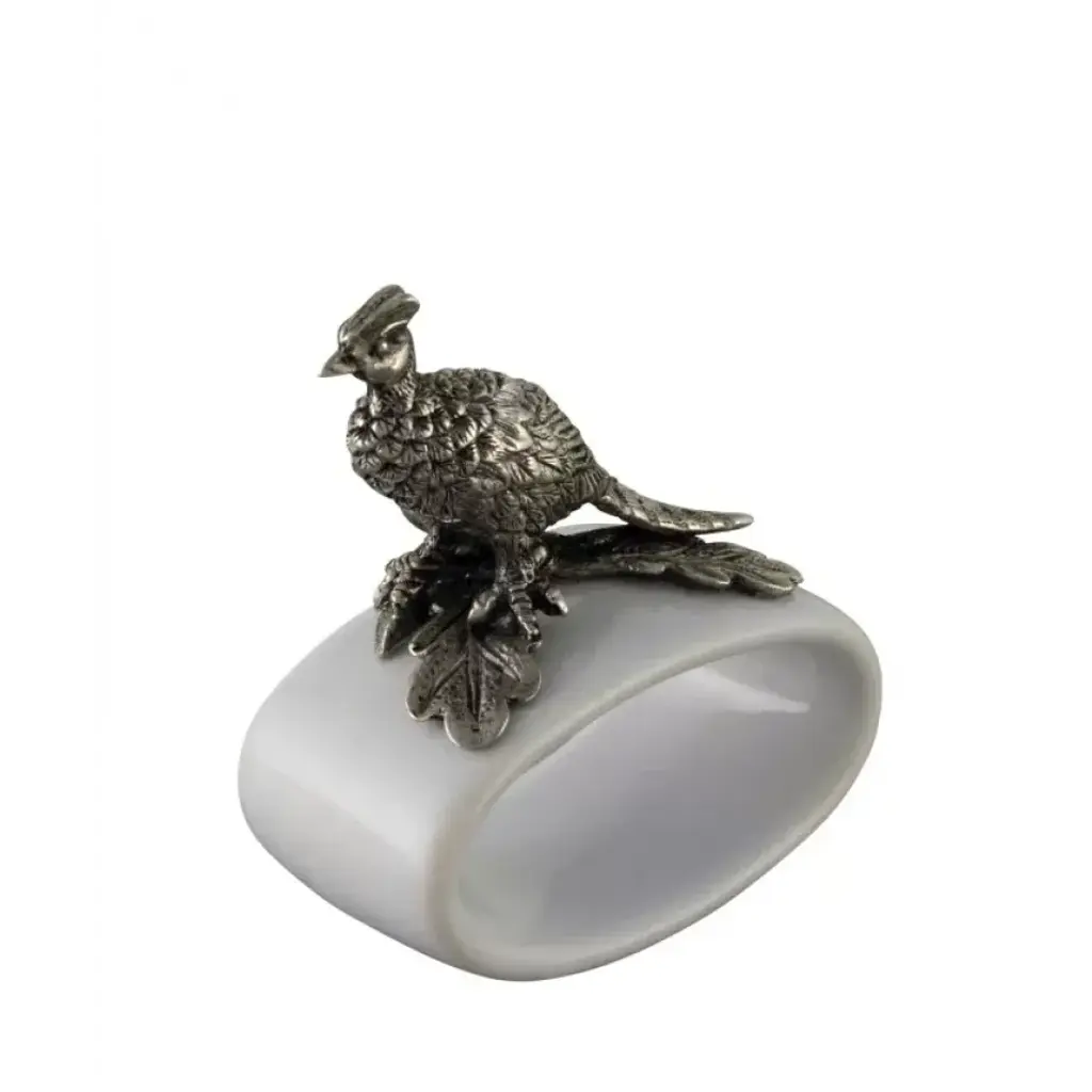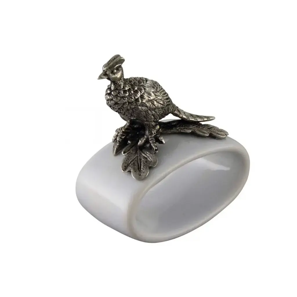 Expressing elegant simplicity of sporting style, Vagabond House's fine stoneware napkin ring is topped with a miniature, detailed pheasant finial. The lustrous neutral tones of our hand-glazed, twice fired white stoneware and cool, silvery pewter decoration enhance almost any color scheme and work well with an assortment of patterns. Vagabond House is a family-owned American company specializing in fine pewter tableware, servingware and giftware. Largely inspired by nature, their exclusive products are designed to be unique, functional heirlooms for those who seek to express tradition and style in both family and formal entertaining.