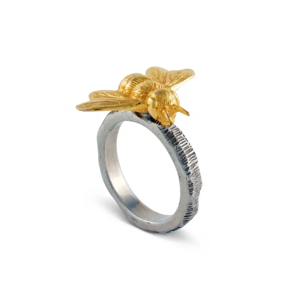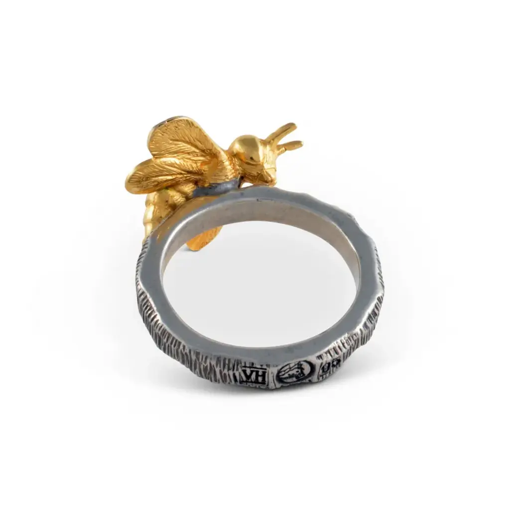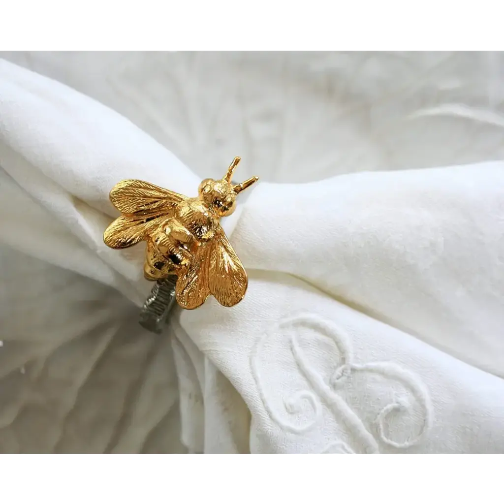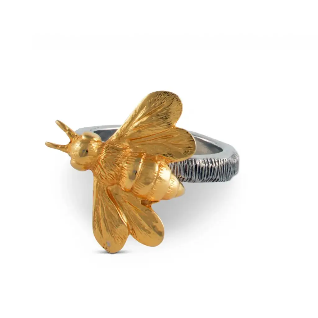 Create a welcoming atmosphere with this charming pewter napkin ring that features a gold bee crafted with intricate details fixed to a metal ring carved with rustic finishes around the circle—exclusively designed by Vagabond House. Touch hearts and delight the spirit of your guests with simple details that transform any dining table. Use these vintage napkin rings to add a cheerful accent for Mothers Day, Weddings, Birthdays, Easter, Christmas, or to identify your fabric napkin. Vagabond House is a family-owned American company specializing in fine pewter tableware, servingware and giftware. Largely inspired by nature, their exclusive products are designed to be unique, functional heirlooms for those who seek to express tradition and style in both family and formal entertaining.