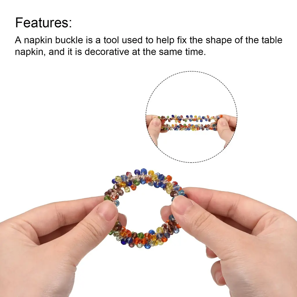 Product Name: Napkin Rings; Material: Acrylic; Color: MulticolorOuter Diameter: 55mm / 2.17"; Inner Diameter: 35mm / 1.38"; Package Content: 2pcs x Napkin RingsDesign: The napkin ring is made of acrylic, shiny, good decorative. Decorate a drab napkin to make it look more sophisticated.Features: A napkin buckle is a tool used to help fix the shape of the table napkin, and it is decorative at the same time. It can be used with the napkin, or it can be used alone as a decorative ornament, which can be reused.Application: Napkin ring is widely used in restaurants, reception, parties, cafes, dance parties, and other places, it is a good choice for decorations such as parties, weddings, Easter, Christmas, Thanksgiving, etc.Description:1. Design: The napkin ring is made of acrylic, shiny, good decorative. Decorate a drab napkin to make it look more sophisticated.2. Features: A napkin buckle is a tool used to help fix the shape of the table napkin, and it is decorative at the same time. It can be used with the napkin, or it can be used alone as a decorative ornament, which can be reused.3. Application: Napkin ring is widely used in restaurants, reception, parties, cafes, dance parties, and other places, it is a good choice for decorations such as parties, weddings, Easter, Christmas, Thanksgiving, etc.Specification:Product Name: Napkin RingsMaterial: AcrylicColor: MulticolorOuter Diameter: 55mm / 2.17"Inner Diameter: 35mm / 1.38"Package Content: 2pcs x Napkin Rings