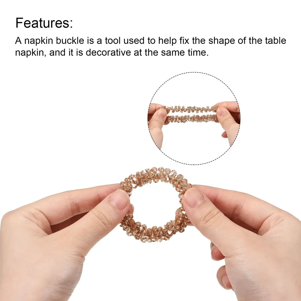 Product Name: Napkin Rings; Material: Acrylic; Color: ChampagneOuter Diameter: 55mm / 2.17"; Inner Diameter: 35mm / 1.38"; Package Content: 4pcs x Napkin RingsDesign: The napkin ring is made of acrylic, shiny, good decorative. Decorate a drab napkin to make it look more sophisticated.Features: A napkin buckle is a tool used to help fix the shape of the table napkin, and it is decorative at the same time. It can be used with the napkin, or it can be used alone as a decorative ornament, which can be reused.Application: Napkin ring is widely used in restaurants, reception, parties, cafes, dance parties, and other places, it is a good choice for decorations such as parties, weddings, Easter, Christmas, Thanksgiving, etc.Description:1. Design: The napkin ring is made of acrylic, shiny, good decorative. Decorate a drab napkin to make it look more sophisticated.2. Features: A napkin buckle is a tool used to help fix the shape of the table napkin, and it is decorative at the same time. It can be used with the napkin, or it can be used alone as a decorative ornament, which can be reused.3. Application: Napkin ring is widely used in restaurants, reception, parties, cafes, dance parties, and other places, it is a good choice for decorations such as parties, weddings, Easter, Christmas, Thanksgiving, etc.Specification:Product Name: Napkin RingsMaterial: AcrylicColor: ChampagneOuter Diameter: 55mm / 2.17"Inner Diameter: 35mm / 1.38"Package Content: 4pcs x Napkin Rings