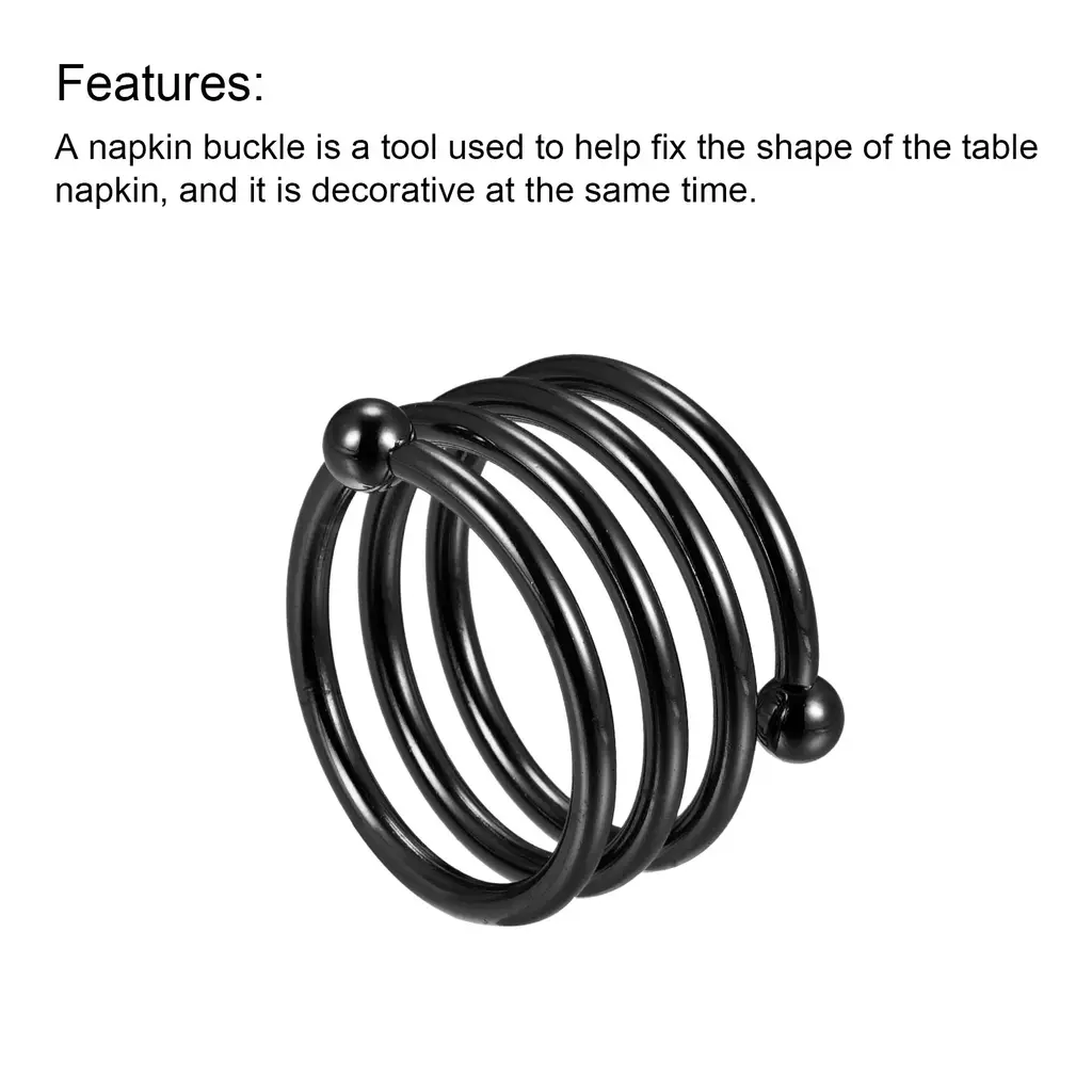Product Name: Napkin Rings; Material: Alloy; Color: BlackOuter Diameter: 45mm / 1.77"; Inner Diameter: 38mm / 1.5"; Total Height: 35mm / 1.38"; Package Content: 6pcs x Napkin RingsDesign: The napkin ring is made of alloy, smooth surface, good decorative. Decorate a drab napkin to make it look more sophisticated.Features: A napkin buckle is a tool used to help fix the shape of the table napkin, and it is decorative at the same time. It can be used with the napkin, or it can be used alone as a decorative ornament, which can be reused.Application: Napkin ring is widely used in restaurants, reception, parties, cafes, dance parties, and other places, it is a good choice for decorations such as parties, weddings, Easter, Christmas, Thanksgiving, etc.Description:1. Design: The napkin ring is made of alloy, smooth surface, good decorative. Decorate a drab napkin to make it look more sophisticated.2. Features: A napkin buckle is a tool used to help fix the shape of the table napkin, and it is decorative at the same time. It can be used with the napkin, or it can be used alone as a decorative ornament, which can be reused.3. Application: Napkin ring is widely used in restaurants, reception, parties, cafes, dance parties, and other places, it is a good choice for decorations such as parties, weddings, Easter, Christmas, Thanksgiving, etc.Specification:Product Name: Napkin RingsMaterial: AlloyColor: BlackOuter Diameter: 45mm / 1.77"Inner Diameter: 38mm / 1.5"Total Height: 35mm / 1.38"Package Content: 6pcs x Napkin Rings