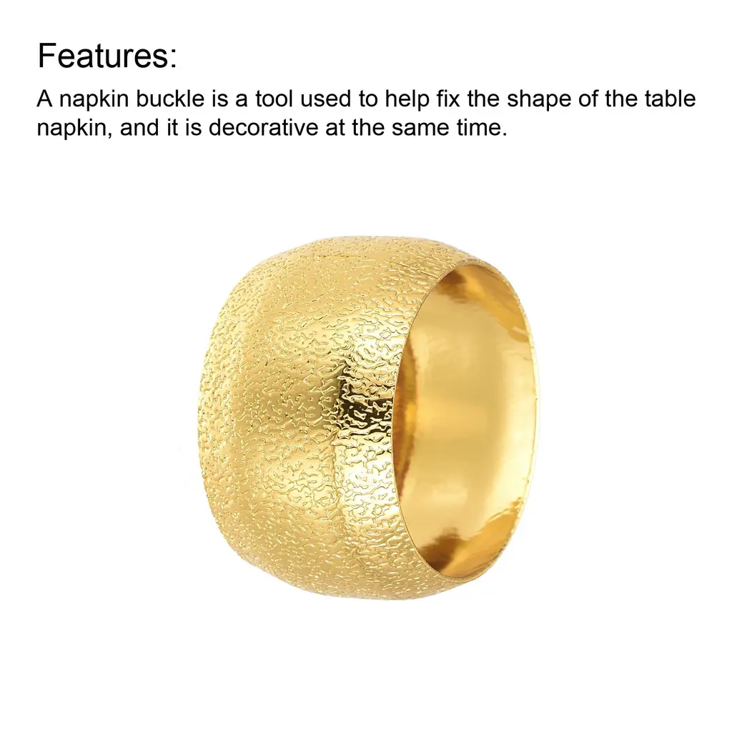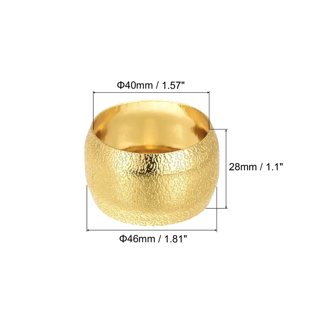 Product Name: Napkin Rings; Material: Alloy; Color: Gold ToneOuter Diameter: 46mm / 1.81"; Inner Diameter: 40mm / 1.57"; Total Height: 28mm / 1.1"; Package Content: 6pcs x Napkin RingsDesign: The napkin ring is made of alloy, good decorative. Decorate a drab napkin to make it look more sophisticated.Features: A napkin buckle is a tool used to help fix the shape of the table napkin, and it is decorative at the same time. It can be used with the napkin, or it can be used alone as a decorative ornament, which can be reused.Application: Napkin ring is widely used in restaurants, reception, parties, cafes, dance parties, and other places, it is a good choice for decorations such as parties, weddings, Easter, Christmas, Thanksgiving, etc.Description:1. Design: The napkin ring is made of alloy, good decorative. Decorate a drab napkin to make it look more sophisticated.2. Features: A napkin buckle is a tool used to help fix the shape of the table napkin, and it is decorative at the same time. It can be used with the napkin, or it can be used alone as a decorative ornament, which can be reused.3. Application: Napkin ring is widely used in restaurants, reception, parties, cafes, dance parties, and other places, it is a good choice for decorations such as parties, weddings, Easter, Christmas, Thanksgiving, etc.Specification:Product Name: Napkin RingsMaterial: AlloyColor: Gold ToneOuter Diameter: 46mm / 1.81"Inner Diameter: 40mm / 1.57"Total Height: 28mm / 1.1"Package Content: 6pcs x Napkin Rings