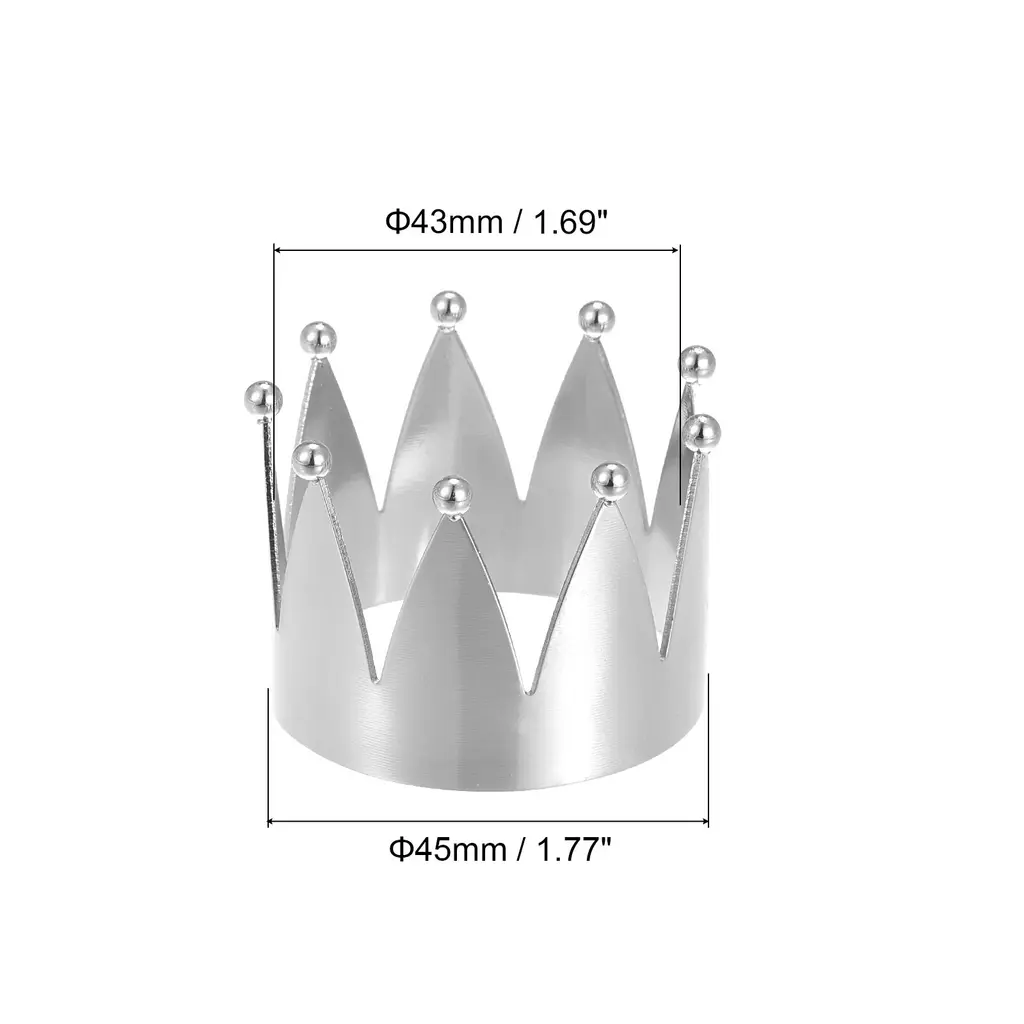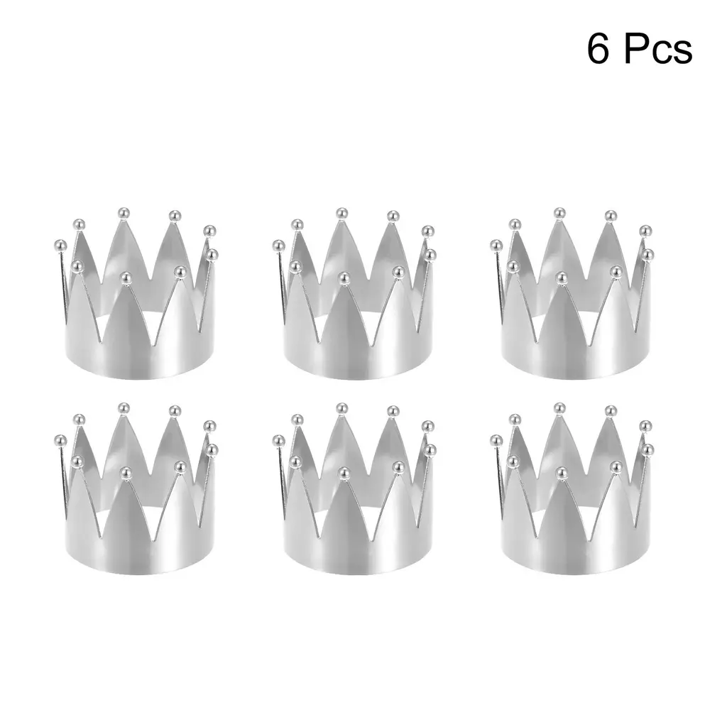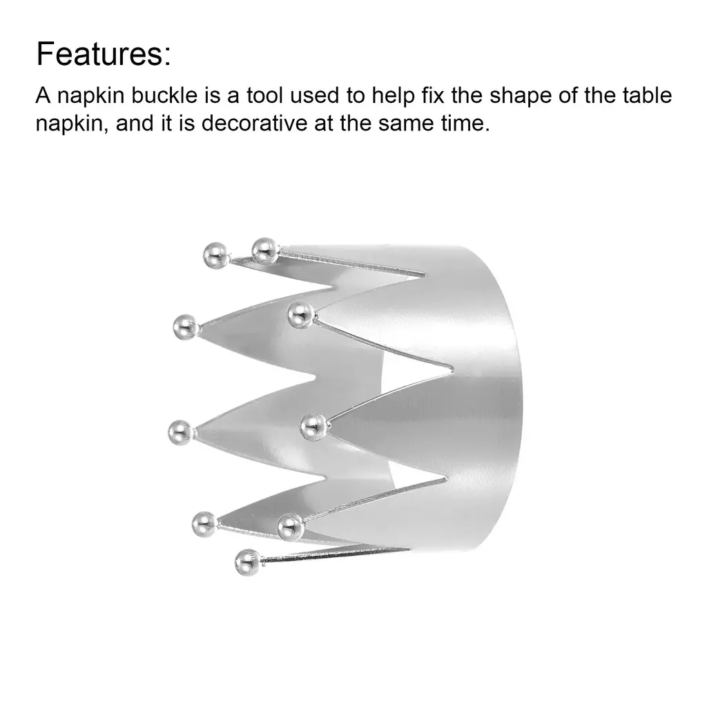 Product Name: Napkin Rings; Material: Alloy; Color: Silver ToneOuter Diameter: 45mm / 1.77"; Inner Diameter: 43mm / 1.69"; Total Height: 34mm / 1.34"; Package Content: 6pcs x Napkin RingsDesign: The crown shape ring is made of alloy, smooth surface, good decorative. Decorate a drab napkin to make it look more sophisticated.Features: A napkin buckle is a tool used to help fix the shape of the table napkin, and it is decorative at the same time. It can be used with the napkin, or it can be used alone as a decorative ornament, which can be reused.Application: Napkin ring is widely used in restaurants, reception, parties, cafes, dance parties, and other places, it is a good choice for decorations such as parties, weddings, Easter, Christmas, Thanksgiving, etc.Description:1. Design: The crown shape ring is made of alloy, smooth surface, good decorative. Decorate a drab napkin to make it look more sophisticated.2. Features: A napkin buckle is a tool used to help fix the shape of the table napkin, and it is decorative at the same time. It can be used with the napkin, or it can be used alone as a decorative ornament, which can be reused.3. Application: Napkin ring is widely used in restaurants, reception, parties, cafes, dance parties, and other places, it is a good choice for decorations such as parties, weddings, Easter, Christmas, Thanksgiving, etc.Specification:Product Name: Napkin RingsMaterial: AlloyColor: Silver ToneOuter Diameter: 45mm / 1.77"Inner Diameter: 43mm / 1.69"Total Height: 34mm / 1.34"Package Content: 6pcs x Napkin Rings