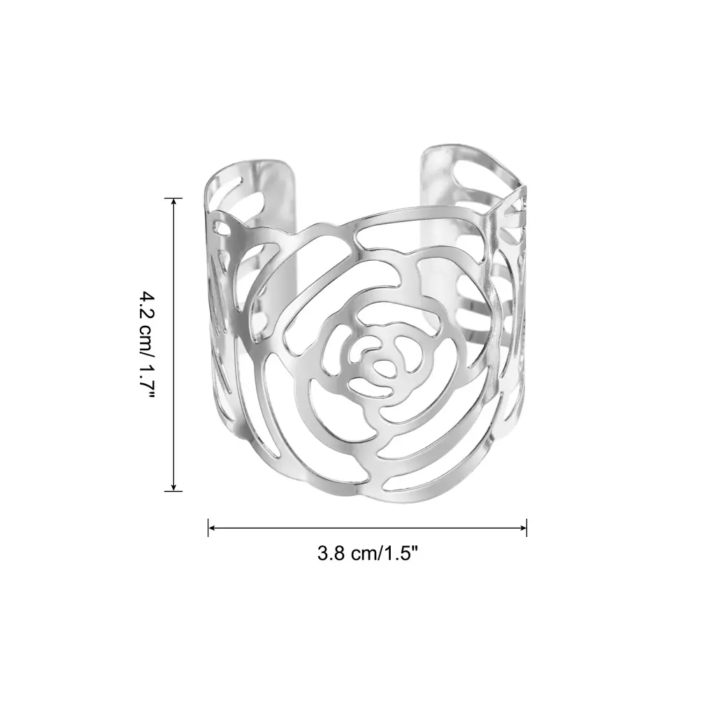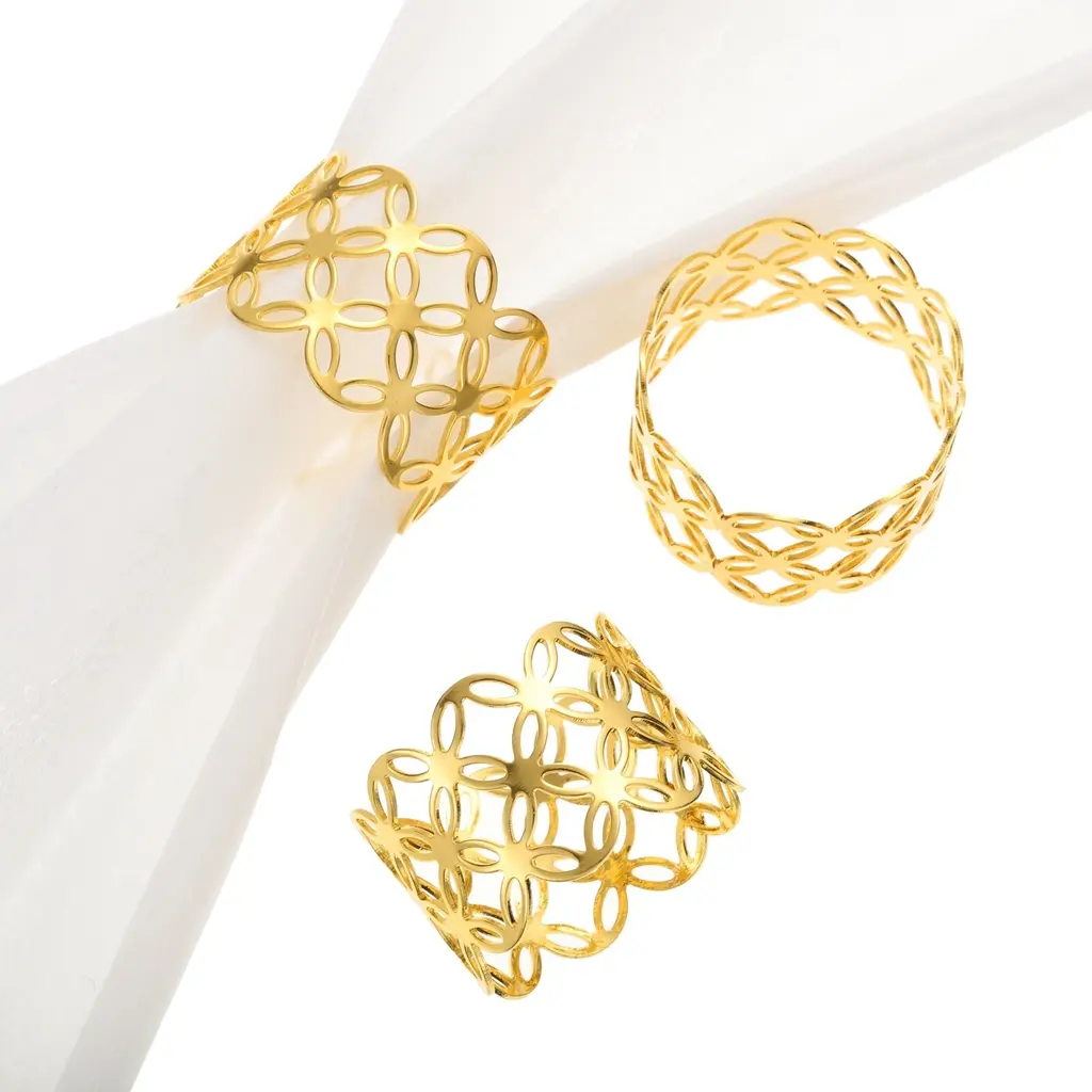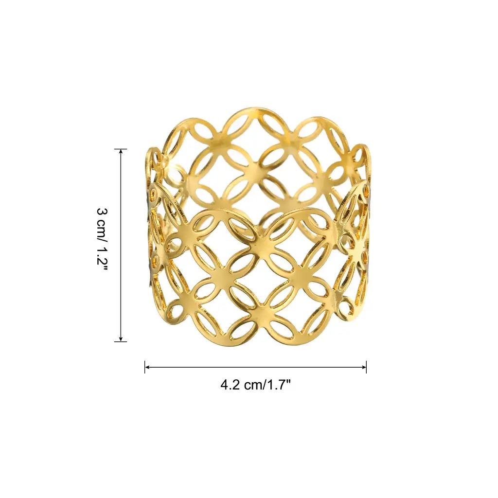 Description:1. These hollow copper coin pattern napkin ring holders are made of wear-resistant and durable metal, the napkin rings' bulk is light and delicate but resistant to scratching.2. The napkin ring buckle features an hollow copper coin pattern design and looks simple and clean. Still, the napkin buckles are versatile, and great for enhancing your table setting, adding a modern touch to your table decor.3. This metal table napkin holder is easy to use, fold the cloth napkin as you want, then insert the napkin into the ring and place it on your table as a stylish and functional decoration.4. These napkin rings are used extensively in homes, parties, bars, cafes, and weddings and are suitable for dinner parties, wedding receptions, holiday gatherings, and any other special occasion.Specification:Material: MetalColor: GoldDiameter: 4.2 cm/1.7"Height: 3 cm/ 1.2"Package Included: 6pcs x napkin rings