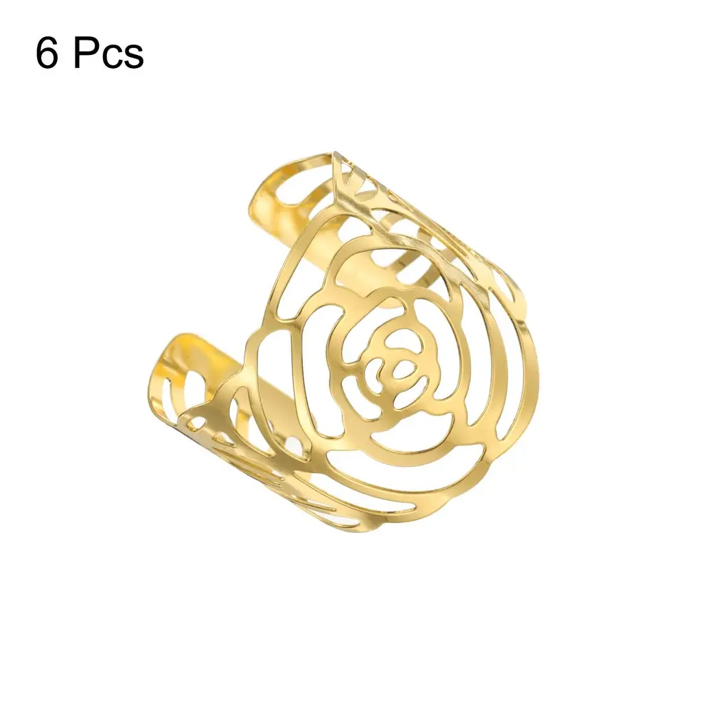 Description:1. These hollow rose pattern napkin ring holders are made of wear-resistant and durable metal, the napkin rings' bulk is light and delicate but resistant to scratching.2. The napkin ring buckle features an hollow rose pattern design and looks simple and clean. Still, the napkin buckles are versatile, and great for enhancing your table setting, adding a modern touch to your table decor.3. This metal table napkin holder is easy to use, fold the cloth napkin as you want, then insert the napkin into the ring and place it on your table as a stylish and functional decoration.4. These napkin rings are used extensively in homes, parties, bars, cafes, and weddings and are suitable for dinner parties, wedding receptions, holiday gatherings, and any other special occasion.Specification:Material: MetalColor: GoldDiameter: 3.8 cm/1.5"Height: 4.2 cm/ 1.7"Package Included: 12pcs x napkin rings