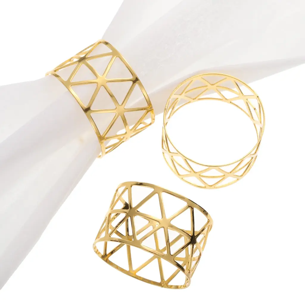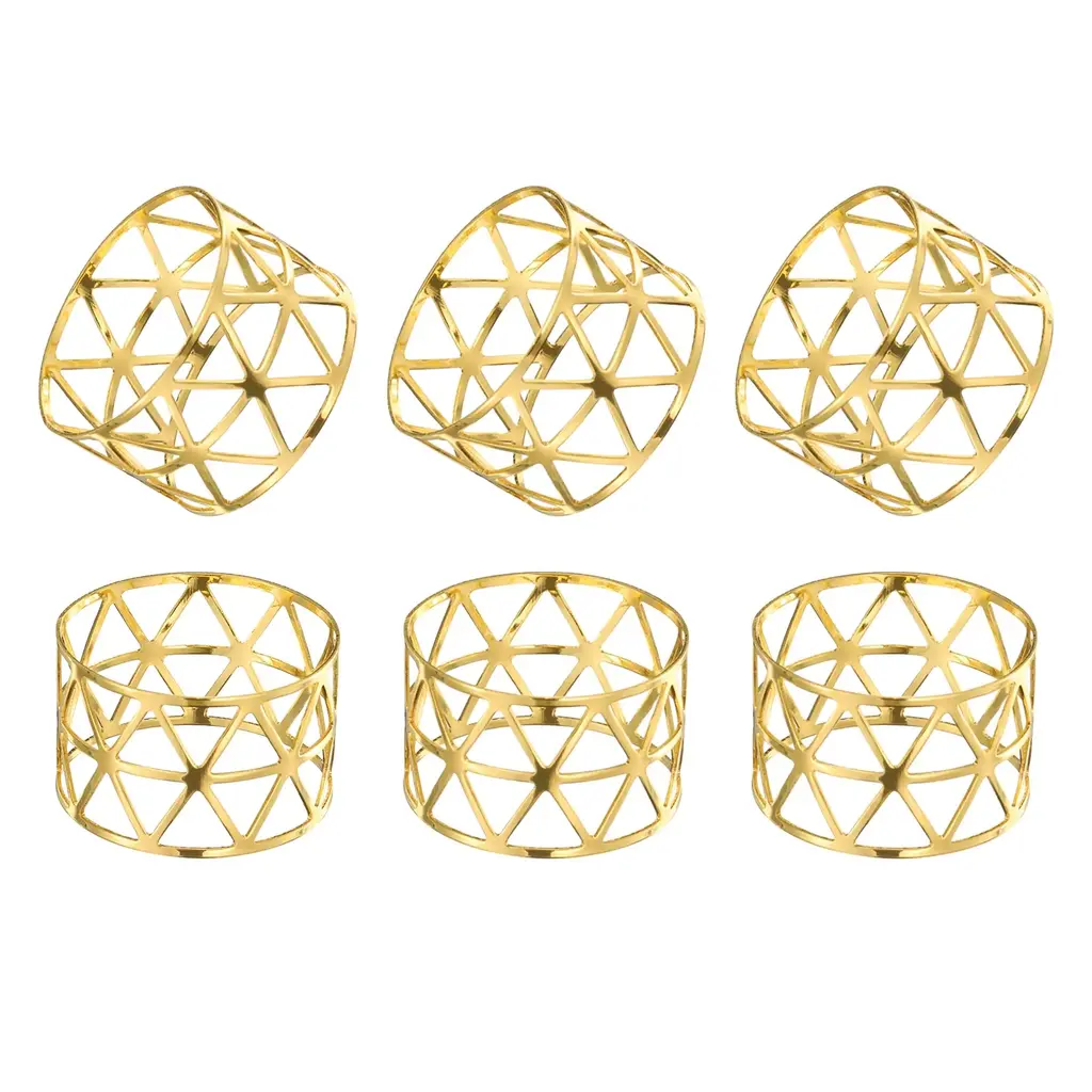 Description:1. These triangle-shaped napkin ring holders are made of wear-resistant and durable metal, the napkin rings' bulk is light and delicate but resistant to scratching.2. The napkin ring buckle features an triangle-shaped shape design and looks simple and clean. Still, the napkin buckles are versatile, and great for enhancing your table setting, adding a modern touch to your table decor.3. This metal table napkin holder is easy to use, fold the cloth napkin as you want, then insert the napkin into the ring and place it on your table as a stylish and functional decoration.4. These napkin rings are used extensively in homes, parties, bars, cafes, and weddings and are suitable for dinner parties, wedding receptions, holiday gatherings, and any other special occasion.Specification:Material: MetalColor: GoldDiameter: 4.3 cm/1.7"Height: 2.9 cm/ 1.1"Package Included: 6pcs x napkin rings