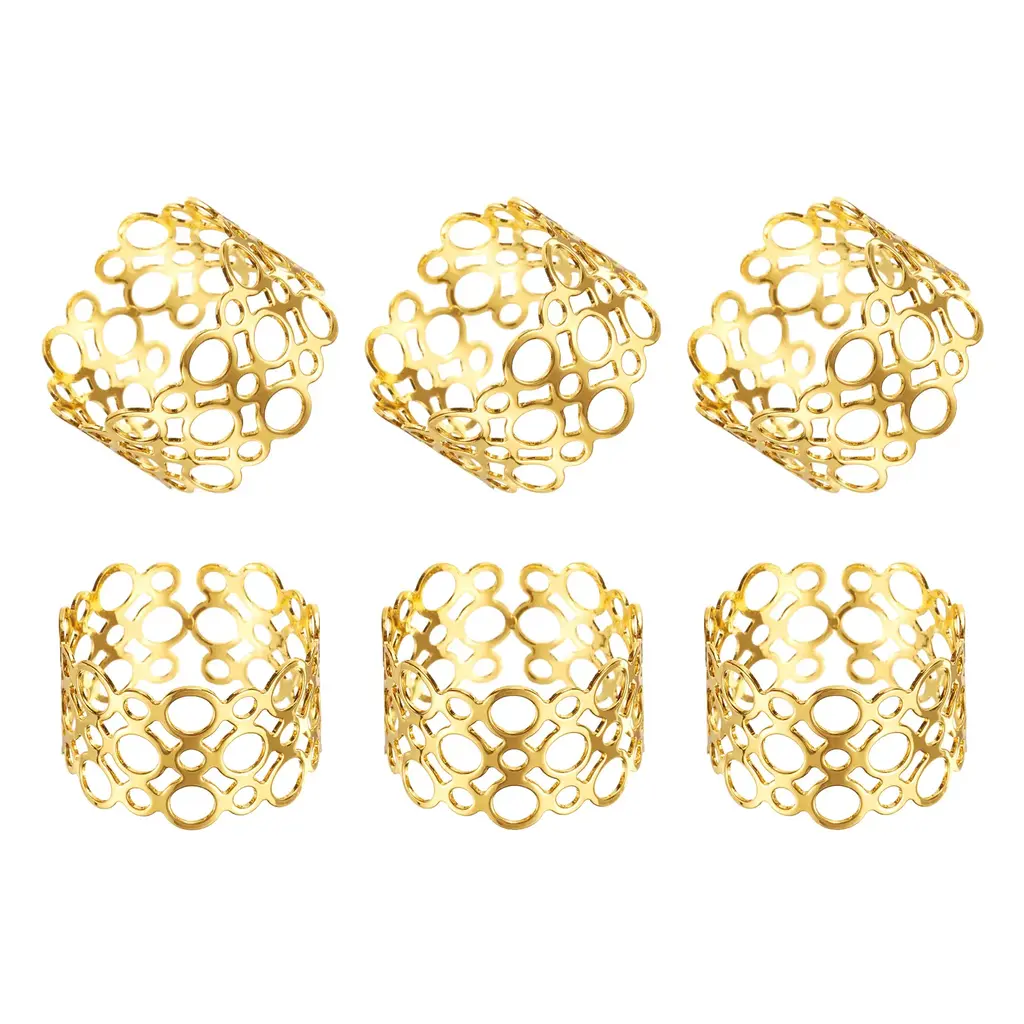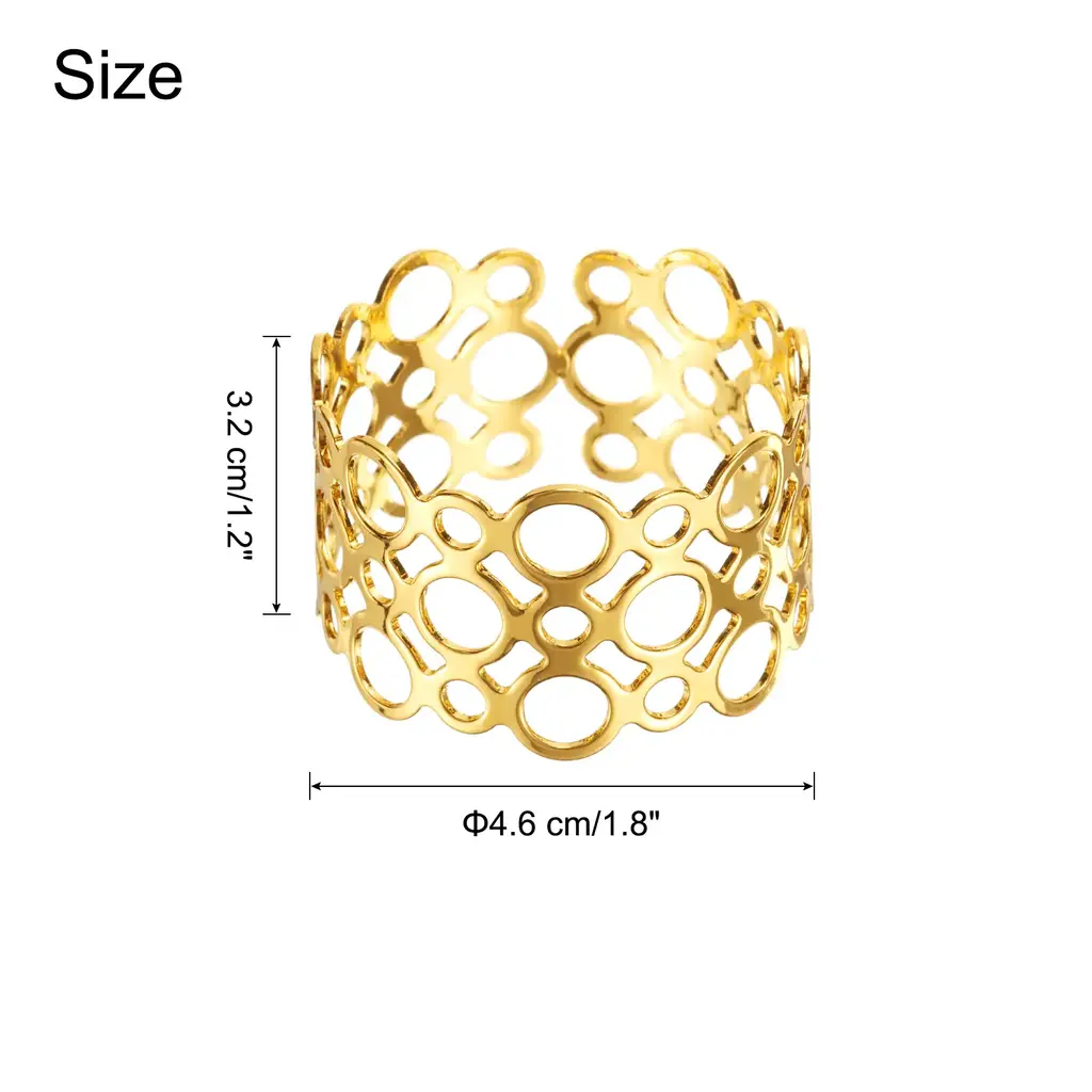 Description:1. These round hollow napkin ring holders are made of wear-resistant and durable metal, the weight of the napkin rings is light and delicate but resistant to scratching.2. The napkin ring buckle features a hollow design and looks simple and clean. However, they are versatile and can be used to add a modern touch to your table decoration.3. This metal napkin holder is easy to use, fold the cloth napkin as required, then insert the napkin into the ring and place it on your table for stylish and functional decoration.4. Suitable for dinner parties, wedding receptions, holiday gatherings, and other special occasions, these napkin rings are widely used in homes, parties, bars, cafes, and weddings.Specification:Material: MetalColor: GoldOuter Diameter: 4.6 cm/1.8"Inner Diameter: 4.4 cm/1.7"Height: 3 cm/ 1.2"Package Included: 6pcs x napkin rings