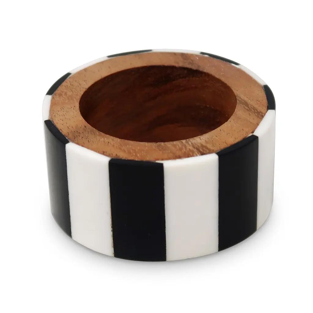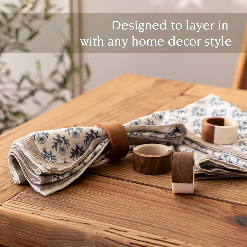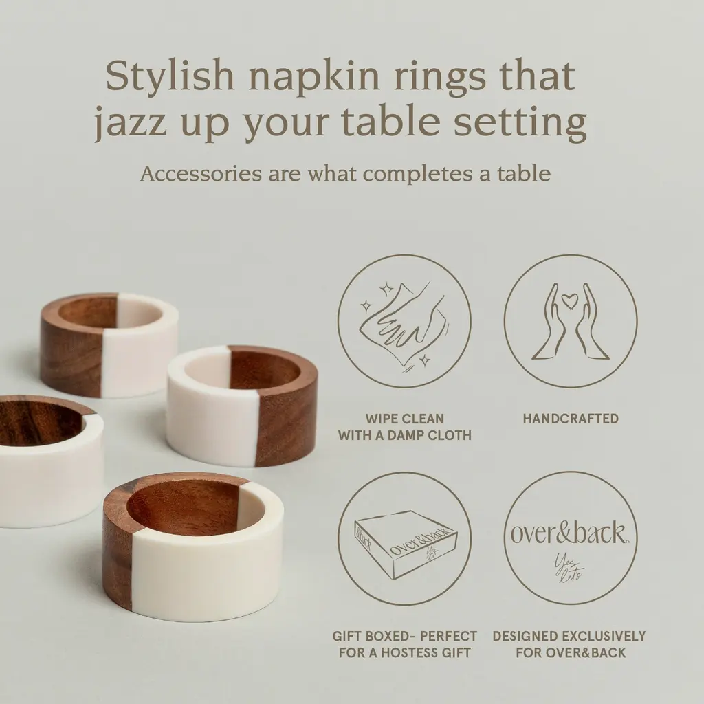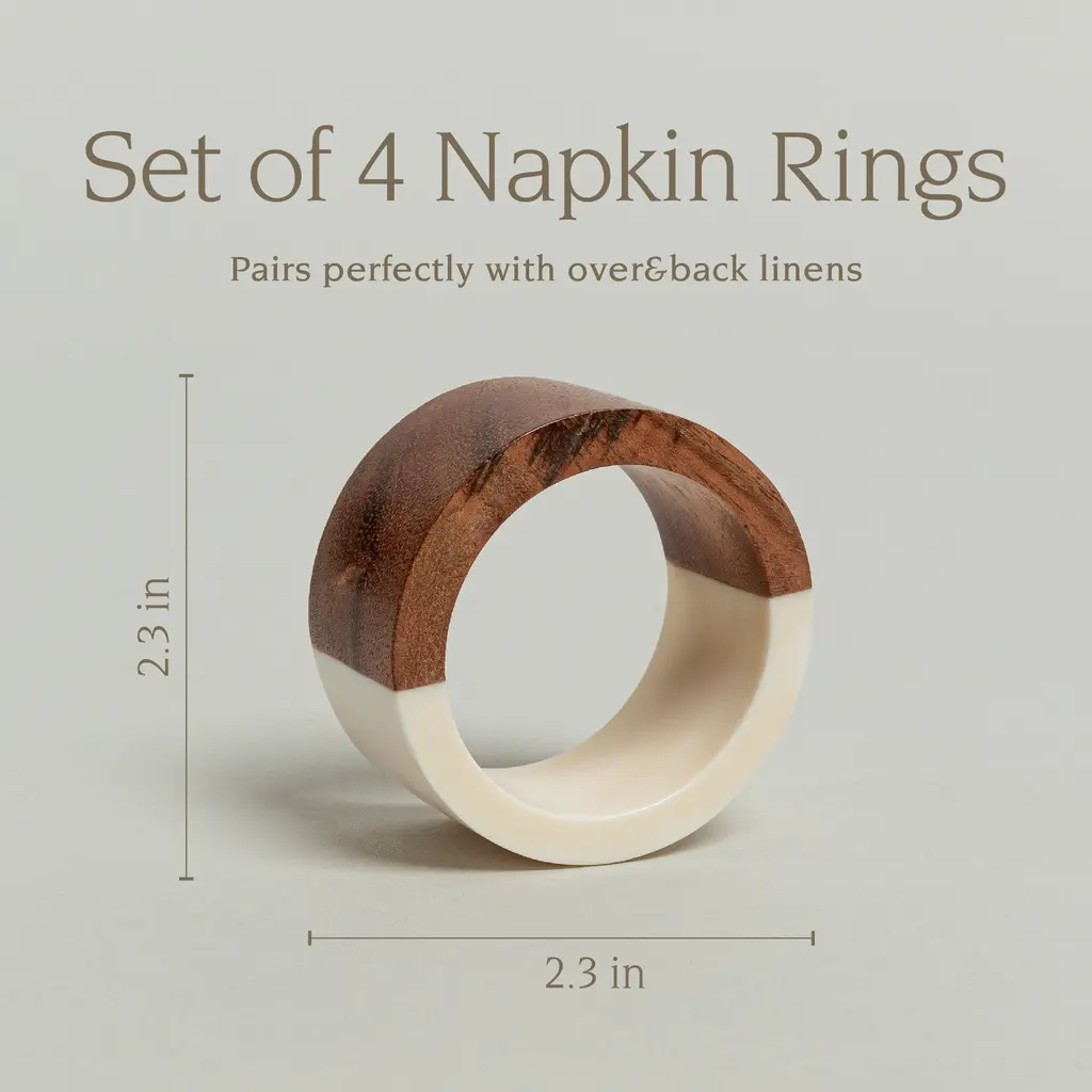 Bring a natural yet refined touch to your dining experience with the over&back Resin Napkin Rings in Wood & Ivory. This wooden napkin rings set of 4 is the perfect blend of rustic charm and modern elegance, making it a must-have addition to your dining décor. Whether you're hosting a formal dinner party or a casual family meal, these wood napkin rings effortlessly complement any table setting. Each napkin ring features a warm wood tone accented by a sleek ivory resin detail, creating a striking contrast that adds visual interest without overwhelming your tablescape. Designed to fit a variety of napkin sizes and styles, these decorative napkin rings are ideal for all occasions—from festive holiday gatherings to everyday meals.Crafted for durability and style, the napkin rings wood design ensures long-lasting use. Whether you're looking for plain wooden napkin rings for a minimalist look or modern napkin rings that add a contemporary twist, this napkin ring set delivers versatility and sophistication. These napkin rings wooden are perfect for seasonal settings, especially as fall napkin rings set of 4, complementing natural centerpieces, earthy tones, and cozy autumn themes. They're also suitable as holiday napkin rings set of 4, adding a subtle yet elegant accent to your festive décor.The napkin rings set of 4 come packaged for convenience, making them a thoughtful gift for housewarmings, weddings, or holiday hosting. Use them alongside your favorite napkins and rings to create a cohesive and polished presentation every time. If you’re decorating for a themed dinner or simply want to elevate your everyday dining, these rings for napkins bring both charm and functionality to the table.Features:Perfect as a part of your napkin set of 4, these napking rings (yes, even if you’re searching with a typo!) blend seamlessly into a wide range of styles. They're also ideal for bulk purchases if you’re looking for napkin rings bulk for larger gatherings or events.Enhance your dining experience with this wooden napkin ring collection from over&back—where style meets simplicity in every detail.