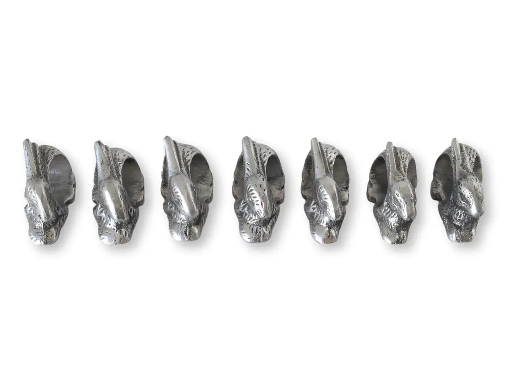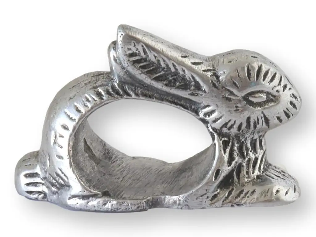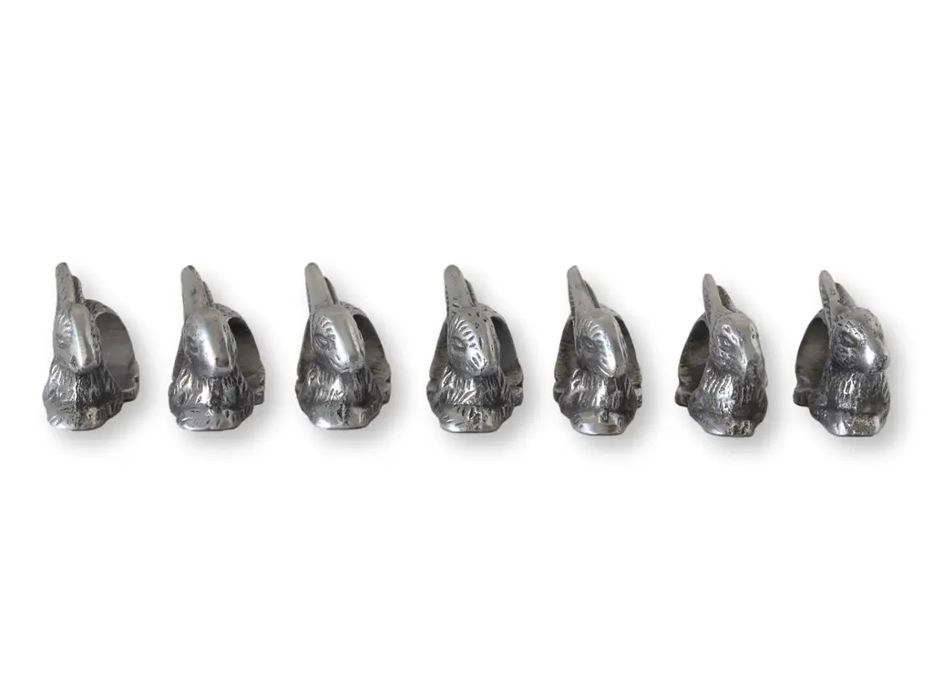 This charming set of seven pewter bunny napkin rings is perfect for adding a playful yet elegant touch to any dining occasion. Their intricate design and fine craftsmanship make them a delightful addition to your tabletop decor.