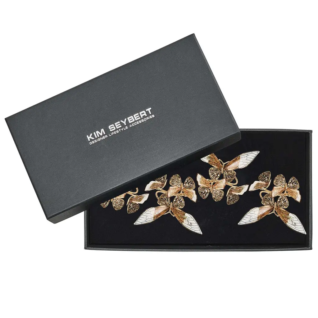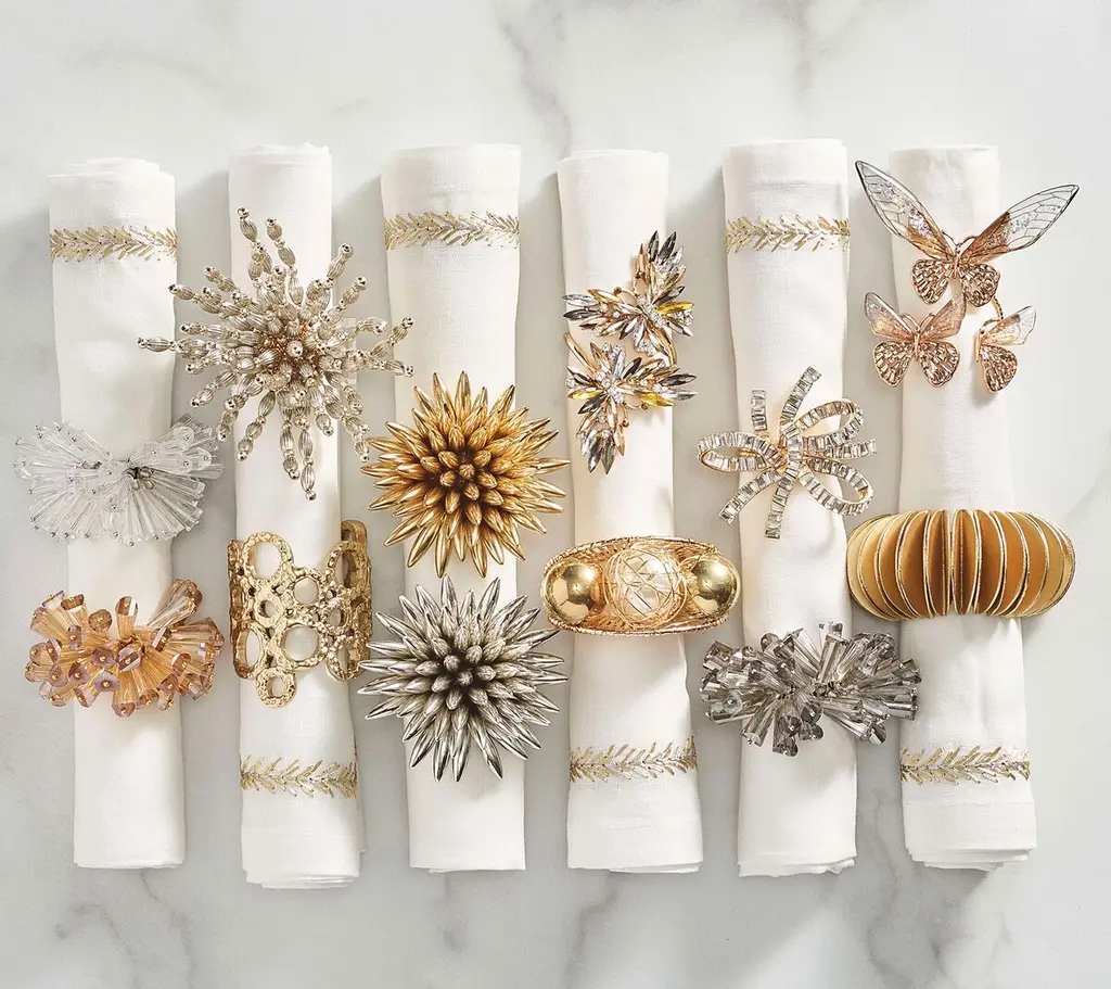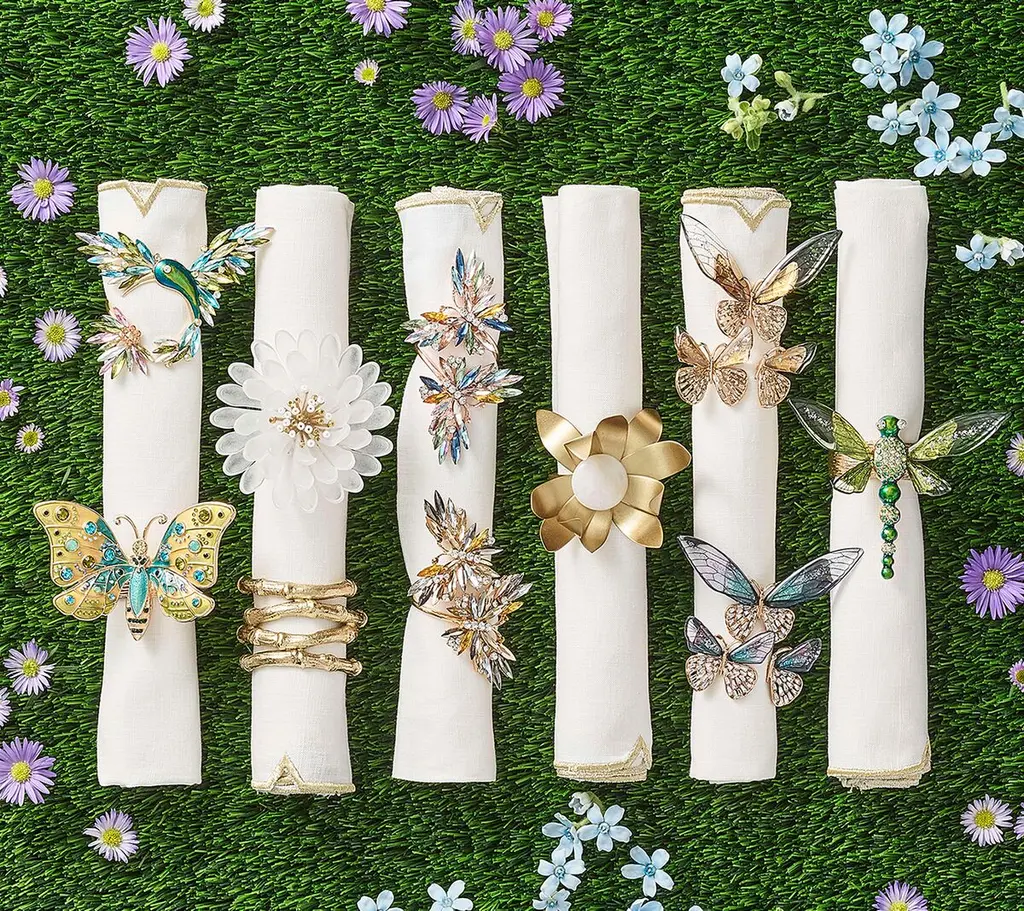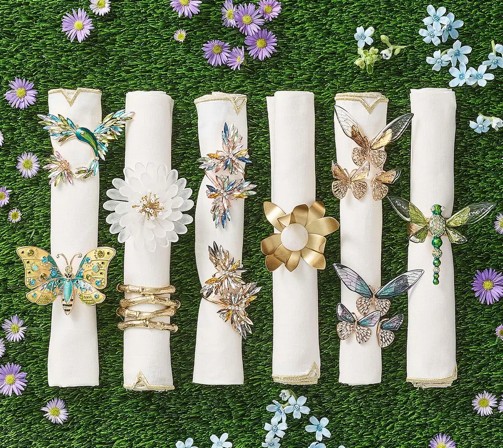The Flutter Napkin Ring showcases a set of three butterflies about to take flight. Delicate transparent acrylic wings sit atop encrusted rhinestone wings. This stunning handmade metal and jeweled napkin ring, sold as a boxed set of four, is the perfect gift.