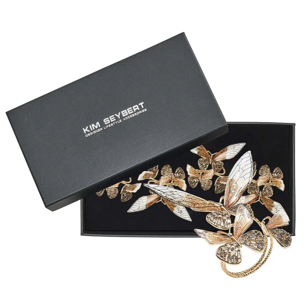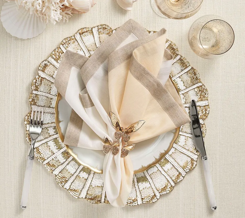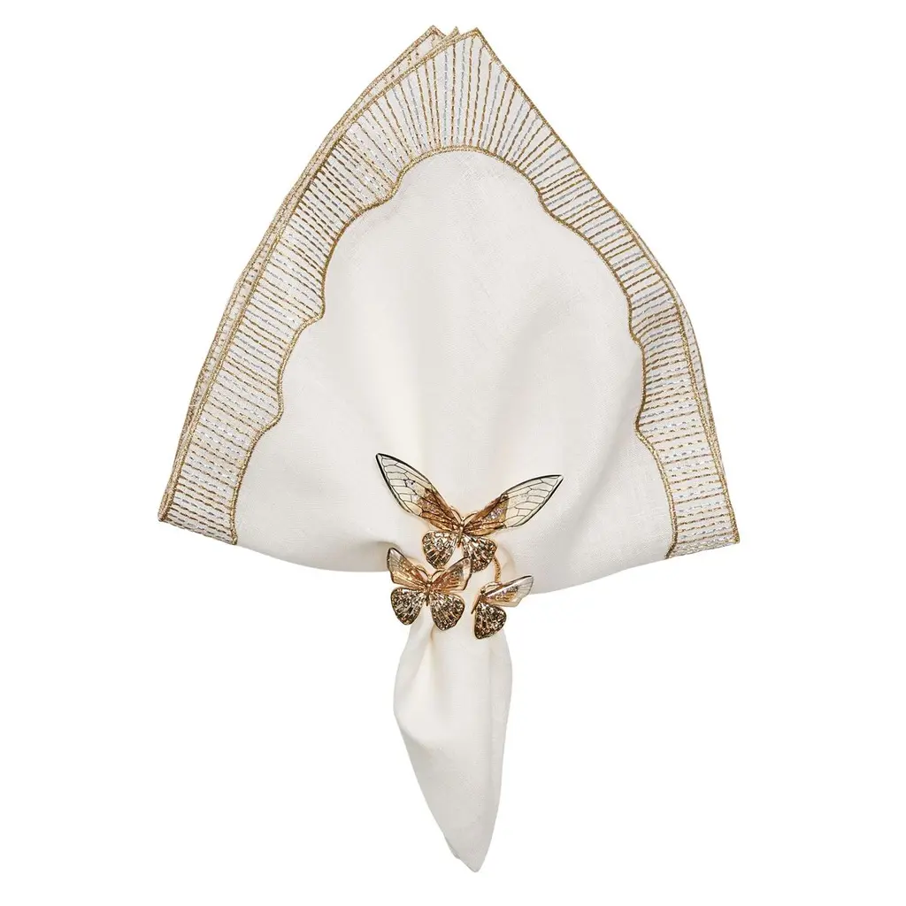 The Flutter Napkin Ring showcases a set of three butterflies about to take flight. Delicate transparent acrylic wings sit atop encrusted rhinestone wings. This stunning handmade metal and jeweled napkin ring, sold as a boxed set of four, is the perfect gift.