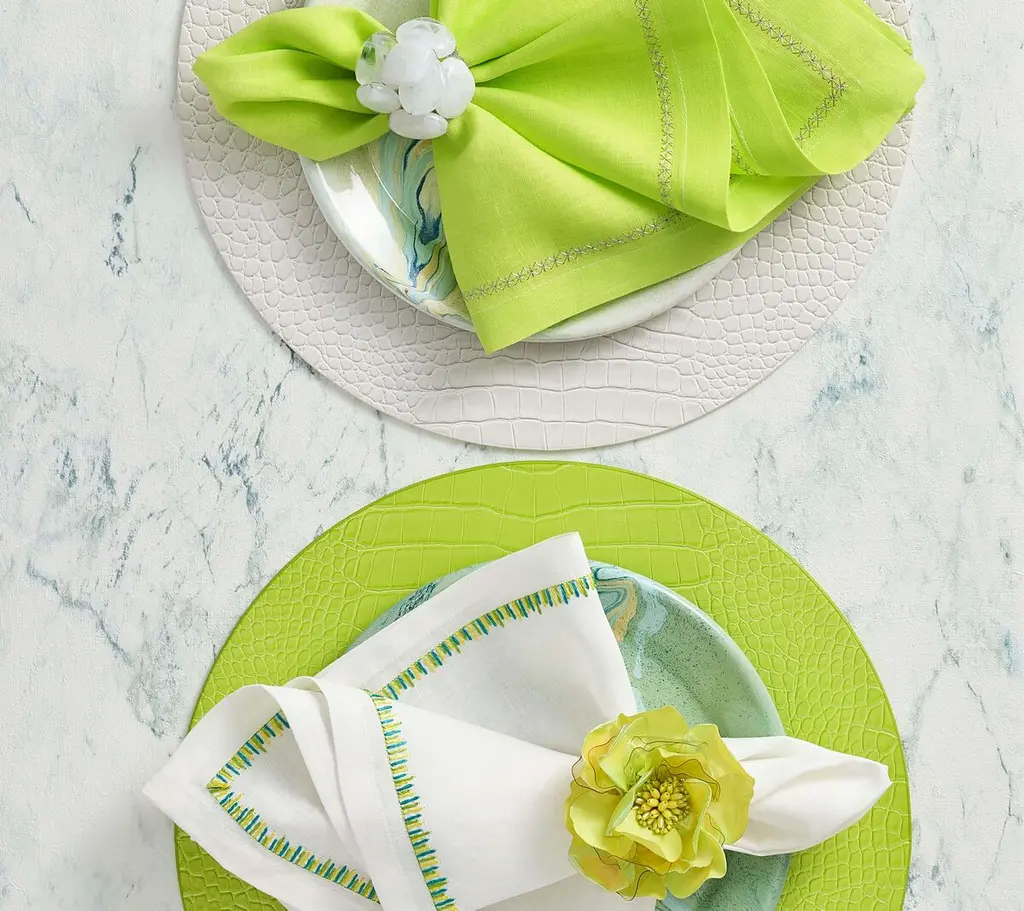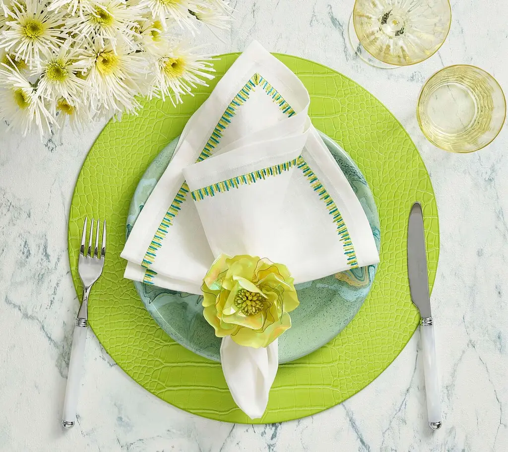 Named for the tropical flower, the Gardenia Napkin Ring depicts the beautiful blossom in full bloom. Sequins are molded by hand to create individual petals, then layered to create a realistic bloom. The lifelike flower sits atop a beaded base. Perfect for garden parties, Easter brunches, and springtime fundraising luncheons.