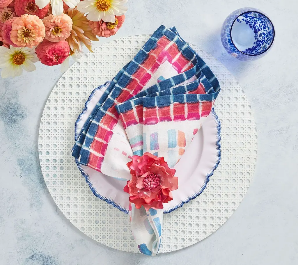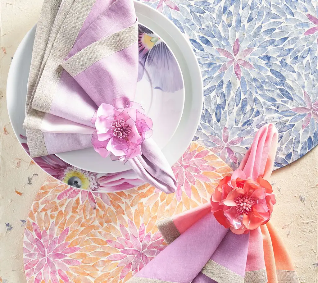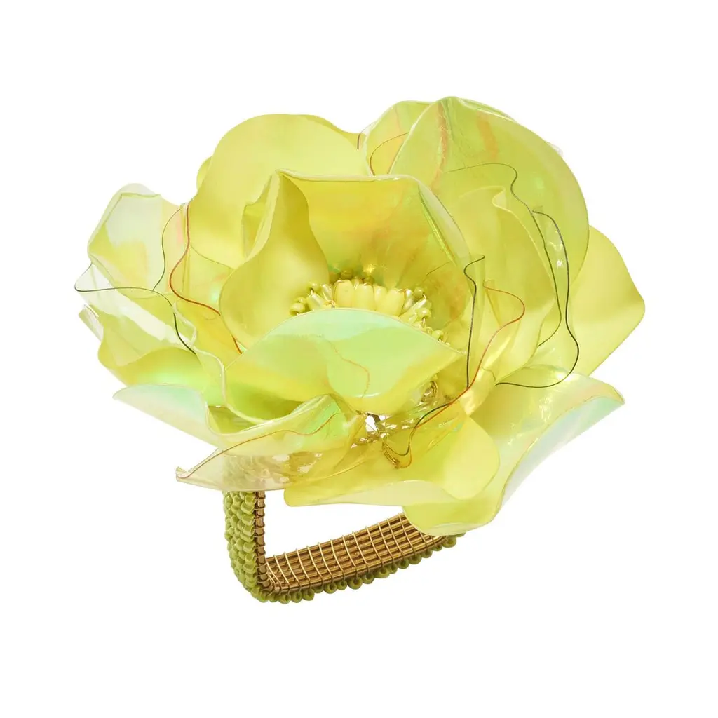 Named for the tropical flower, the Gardenia Napkin Ring depicts the beautiful blossom in full bloom. Sequins are molded by hand to create individual petals, then layered to create a realistic bloom. The lifelike flower sits atop a beaded base. Perfect for garden parties, Easter brunches, and springtime fundraising luncheons.