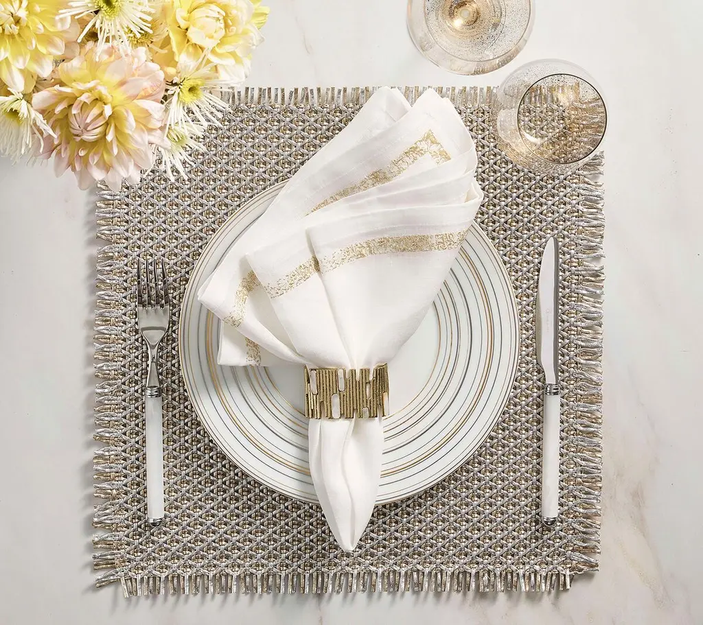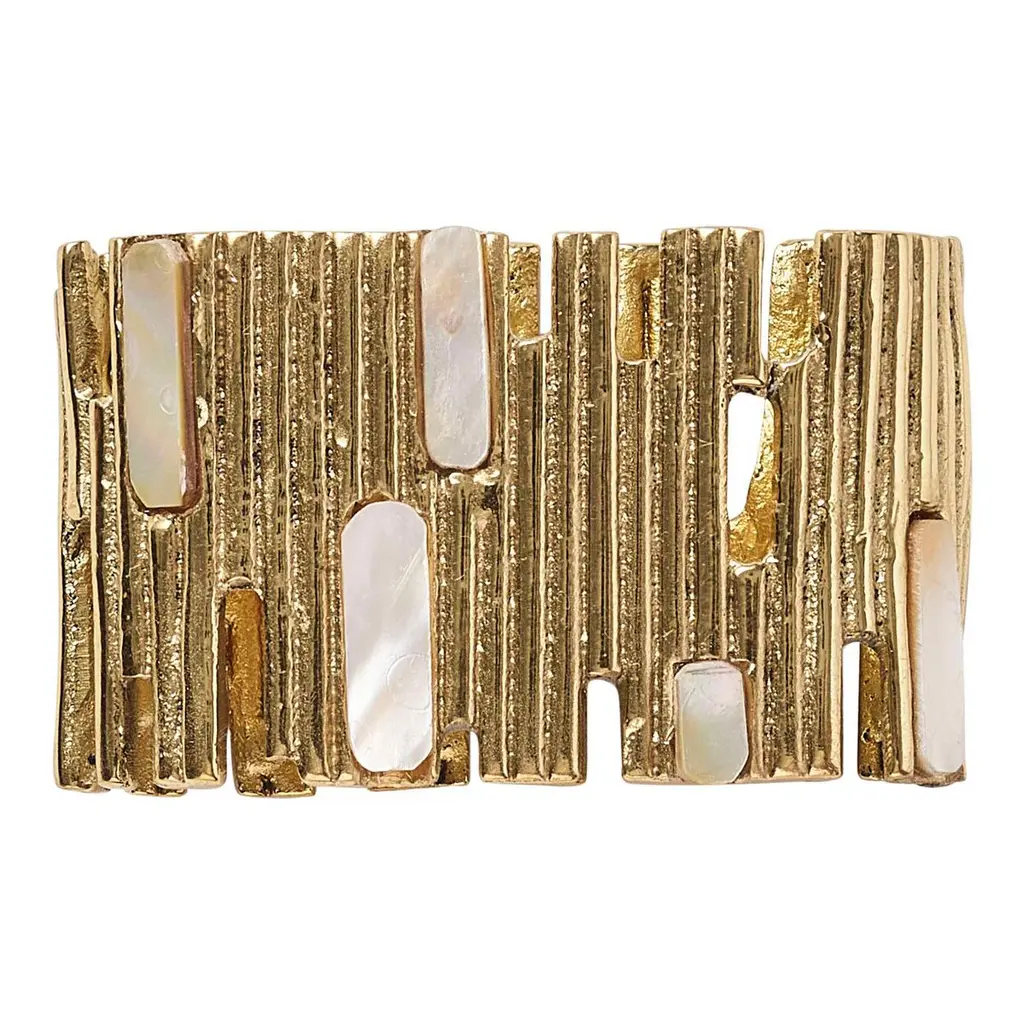 The Matrix napkin ring is table jewelry that demands attention. Its elongated cast brass cuff is adorned with hand-attached mother-of-pearl elements. An organic edge treatment creates a captivating high-low effect on the textured border. The luxurious blend of metal and mother of pearl, combined with the organic design, makes the Matrix a unique accessory for your table.