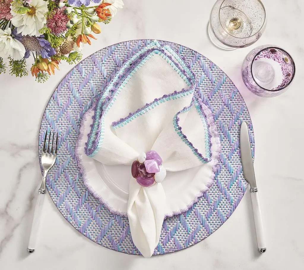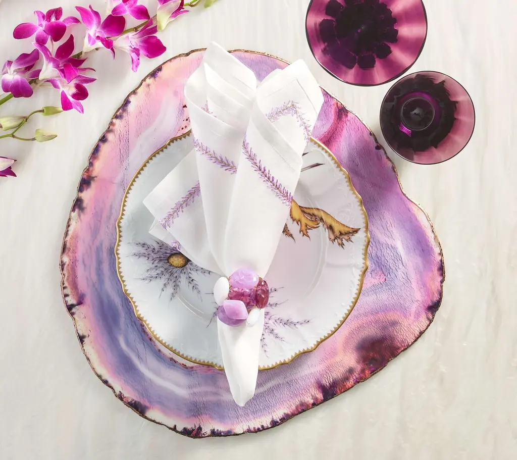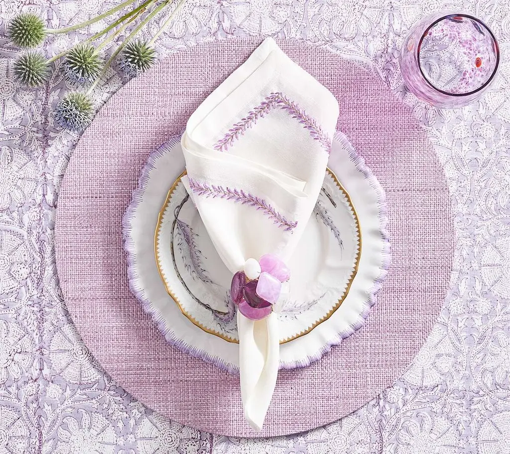 The Sea Stone Napkin Ring features resin stones set in clusters. These napkin rings are reminiscent of tumbled stones found upon the shore. Arranged at random, the stones are mounted on a beautifully beaded napkin ring. These beaded napkin rings are the perfect addition to a bright and cheery table.