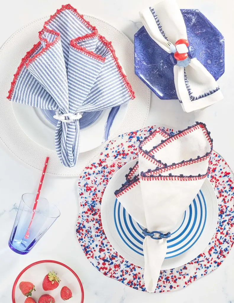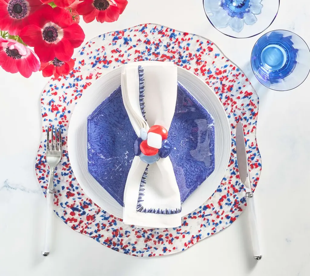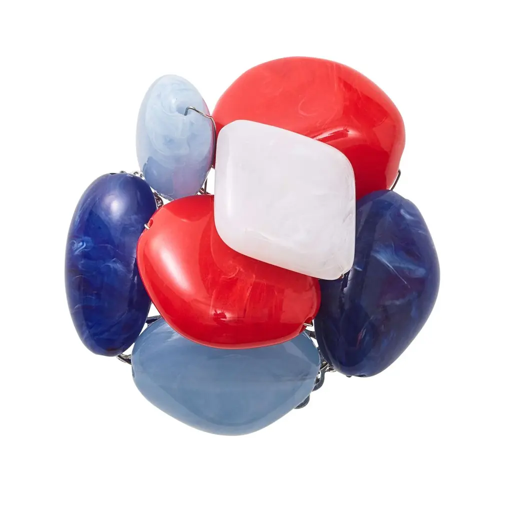 The Sea Stone Napkin Ring features resin stones set in clusters. These napkin rings are reminiscent of tumbled stones found upon the shore. Arranged at random, the stones are mounted on a beautifully beaded napkin ring. These beaded napkin rings are the perfect addition to a bright and cheery table.