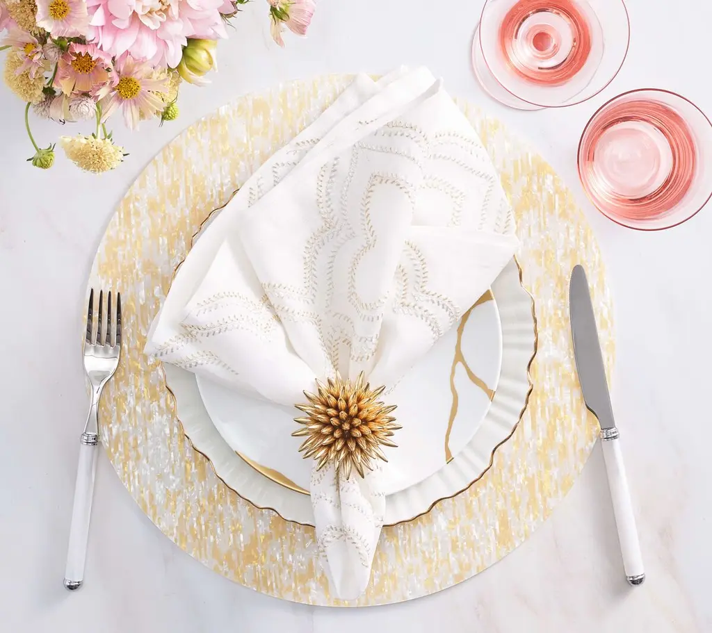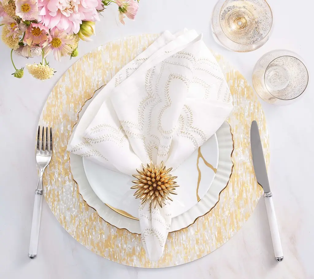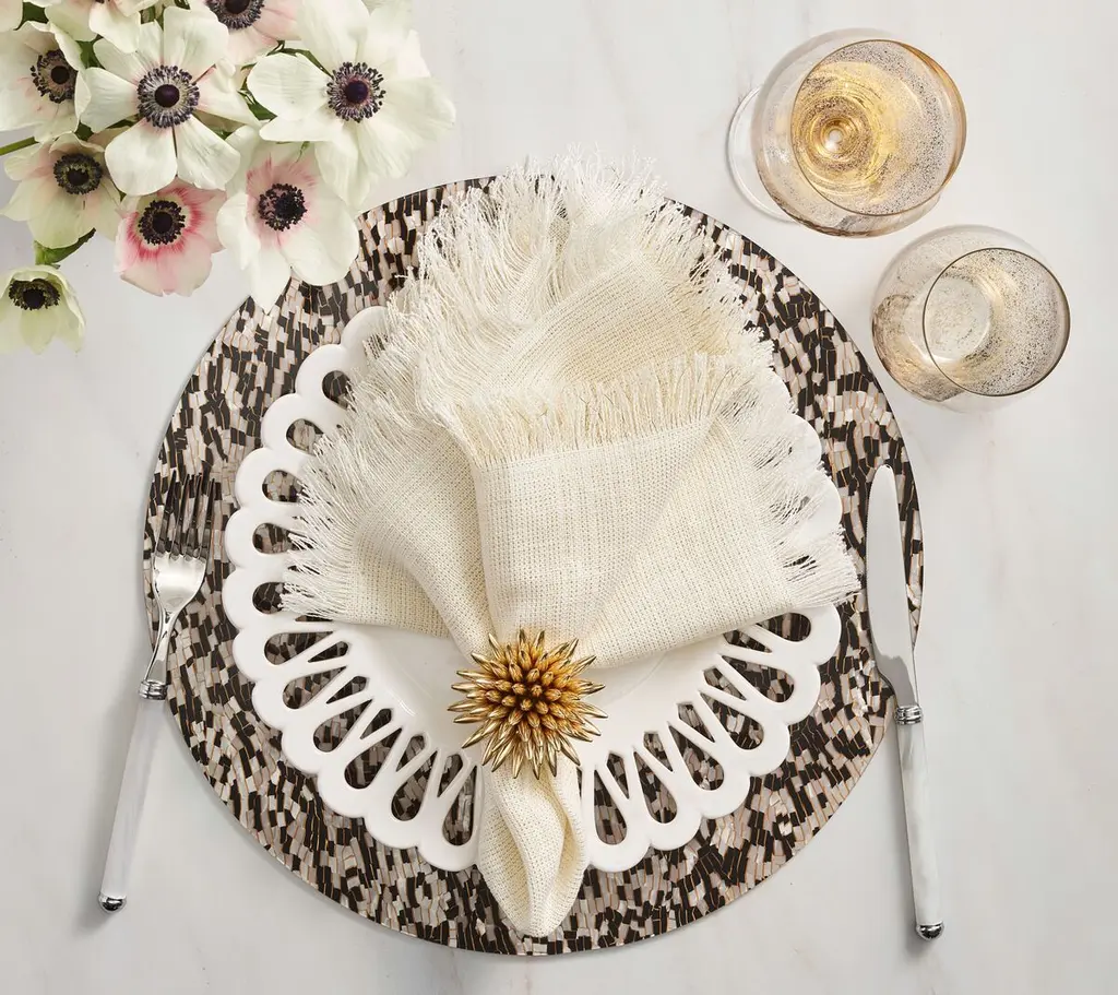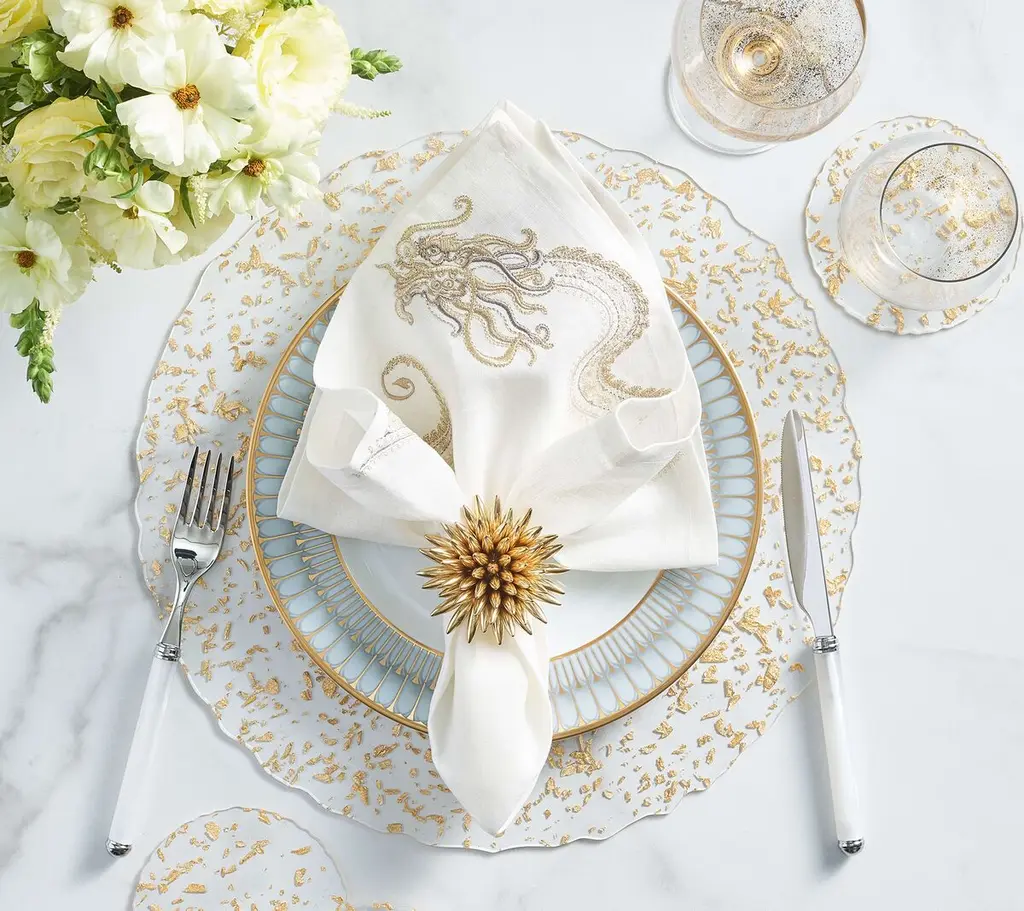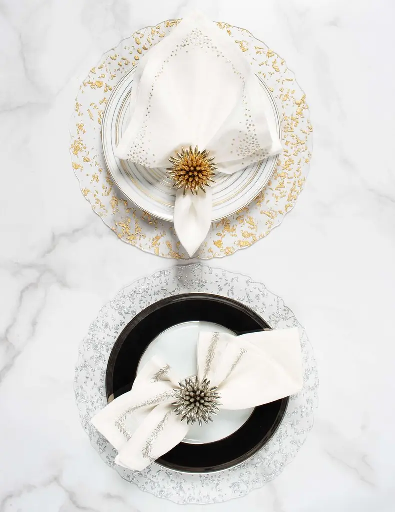 The mid-century-inspired Stellar Napkin Ring is a show-stopper. This beautiful napkin ring features a burst of metallic, oval-shaped beads. The beads are hand-arranged atop a square Lucite ring. This versatile napkin ring works on any table setting.