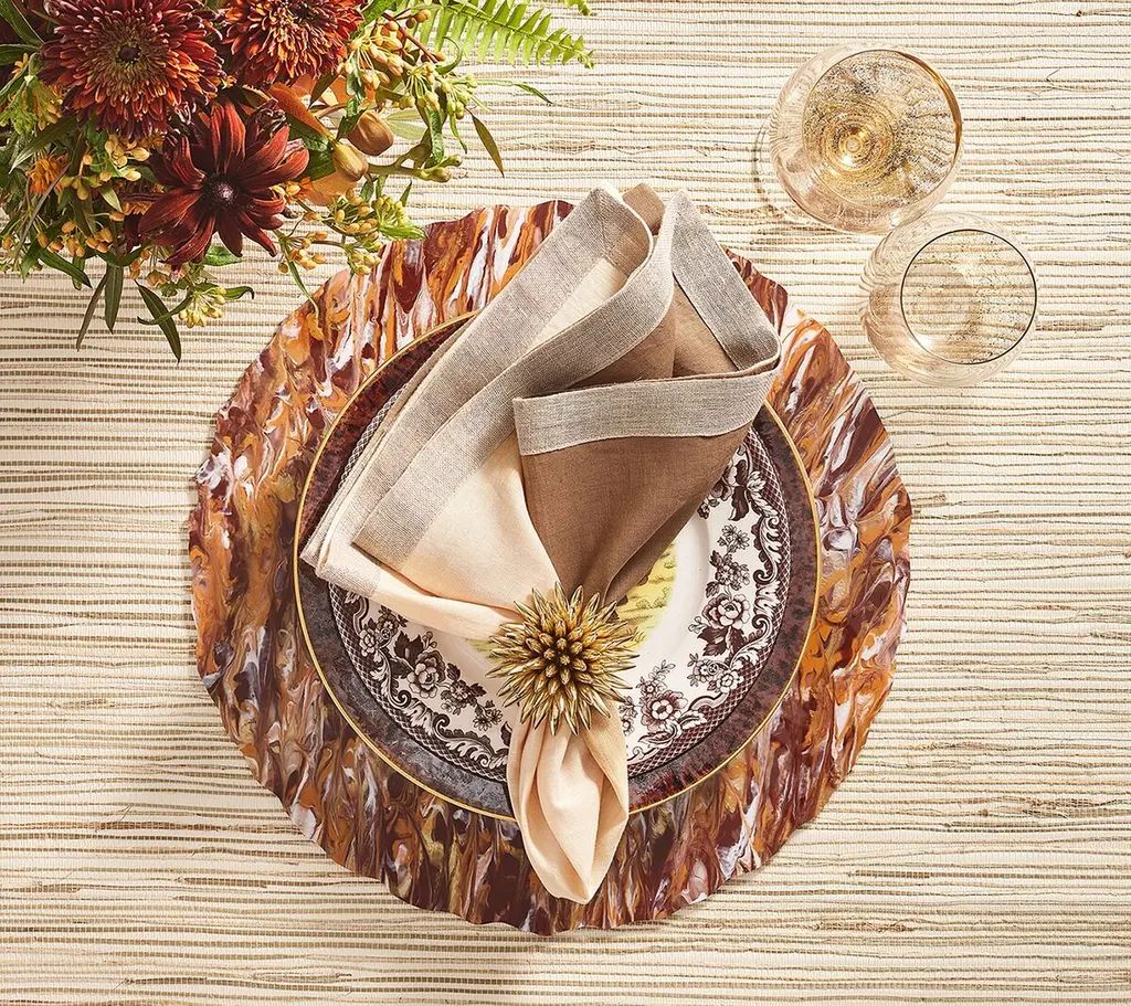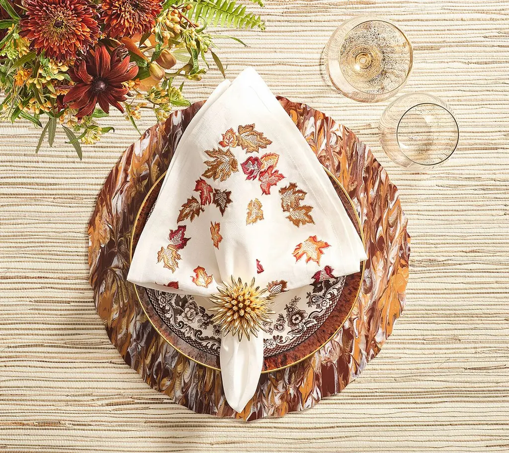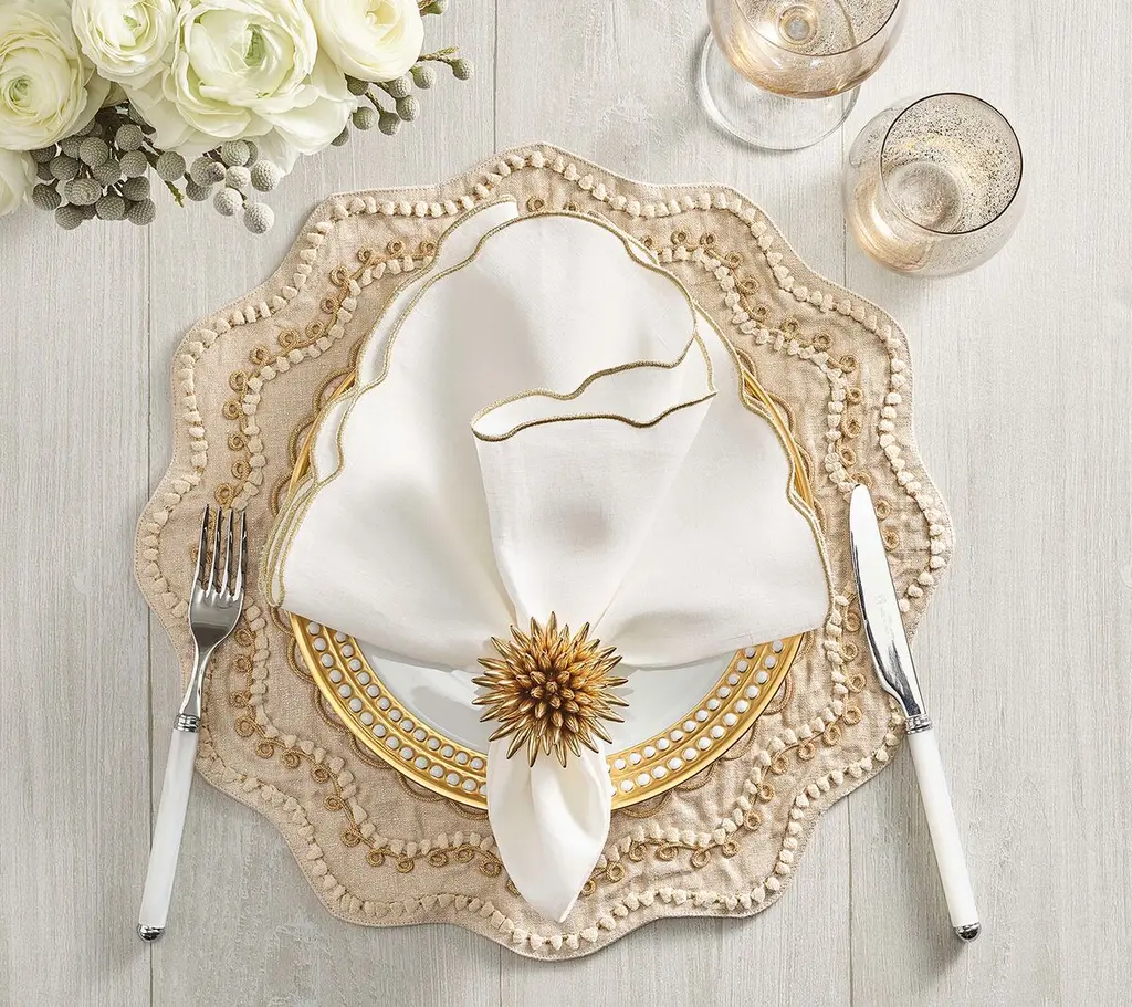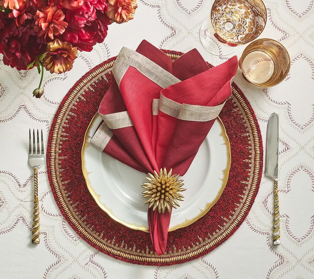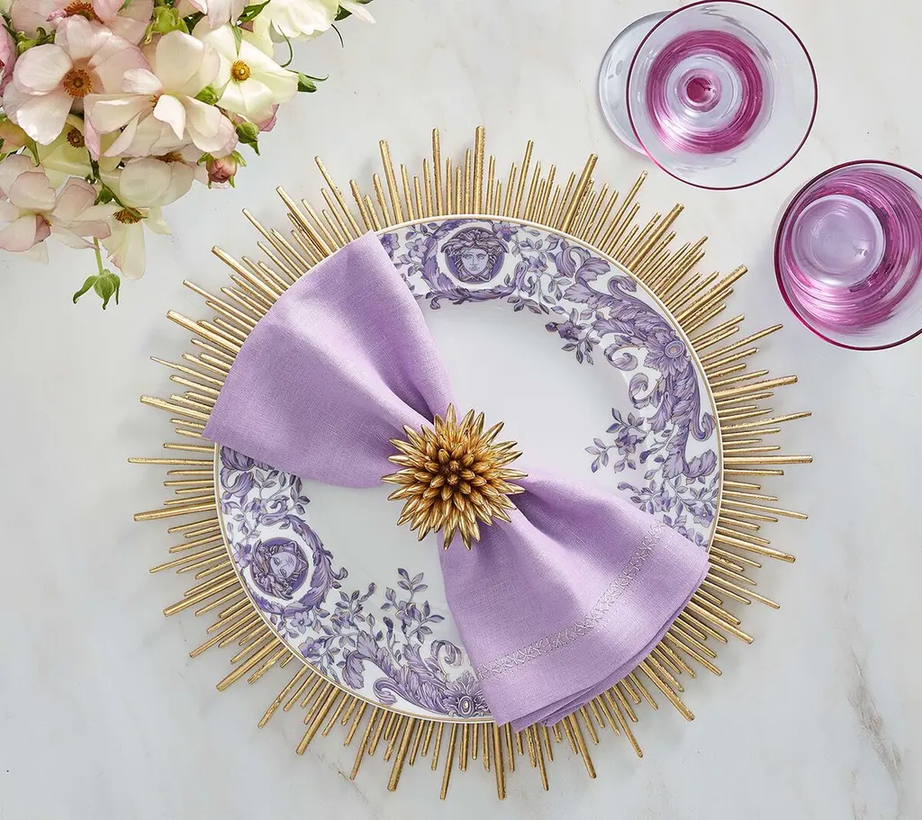 The mid-century-inspired Stellar Napkin Ring is a show-stopper. This beautiful napkin ring features a burst of metallic, oval-shaped beads. The beads are hand-arranged atop a square Lucite ring. This versatile napkin ring works on any table setting.