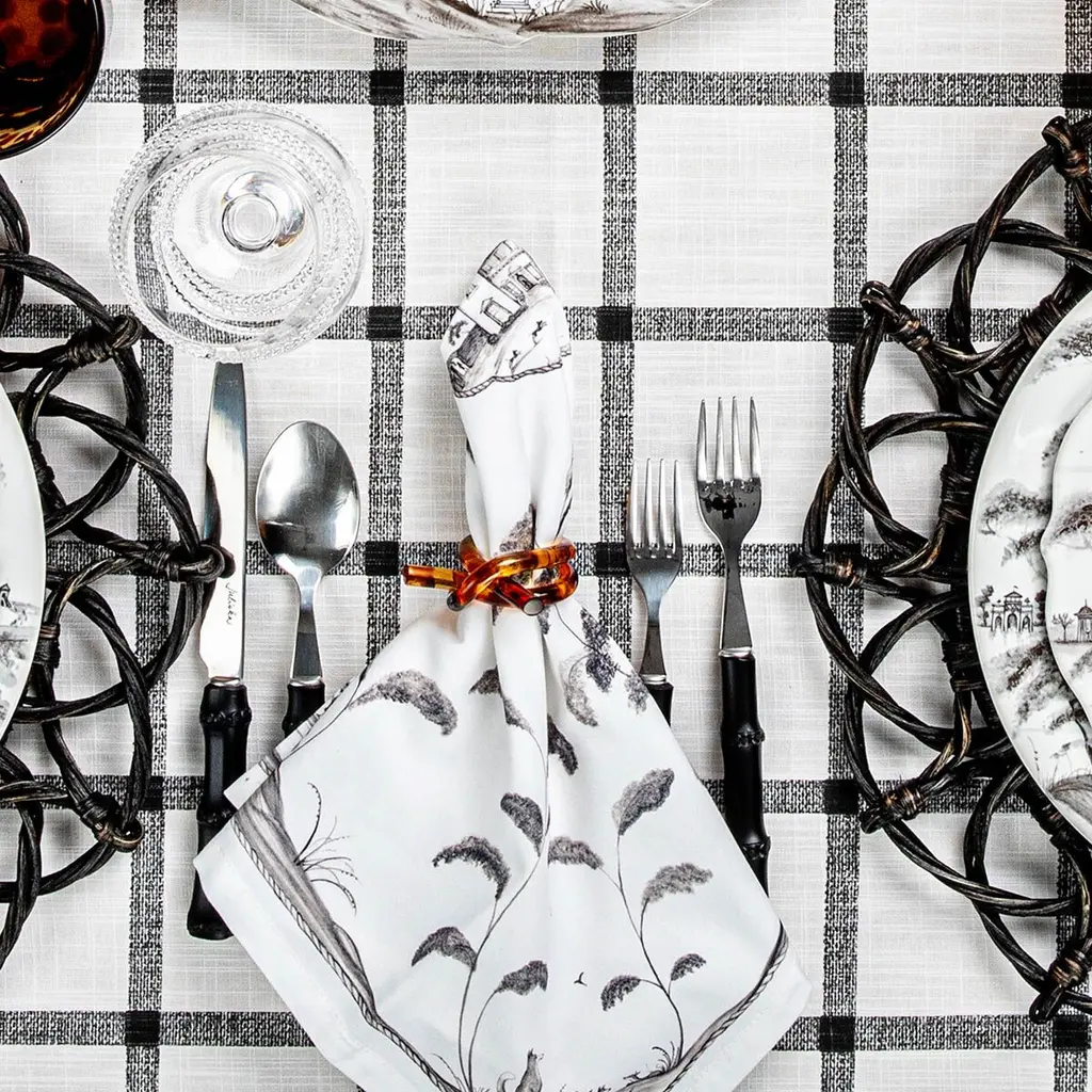 Looping swirls of translucent ambers and browns neatly tie your napkin in place with a permanent knot. Audrey would have loved this.