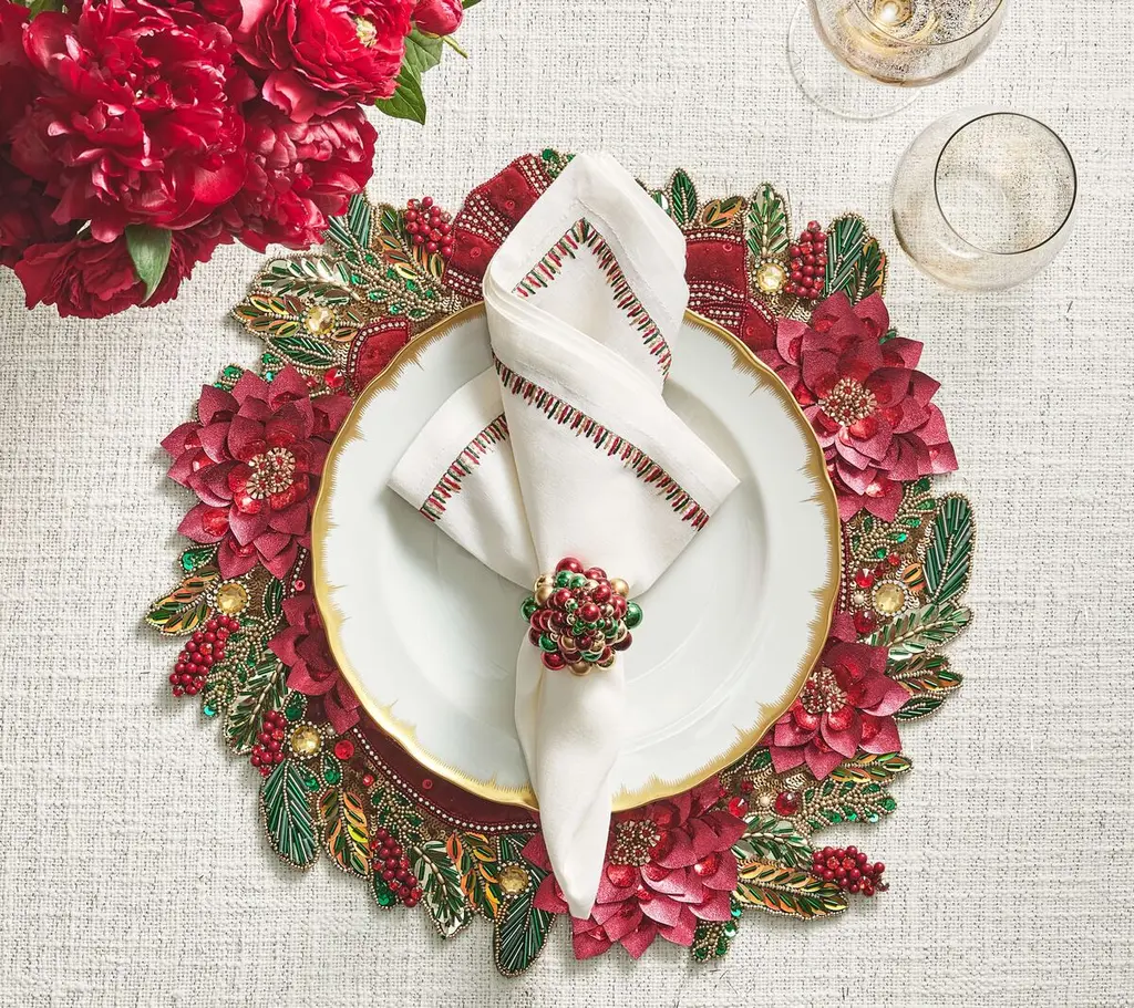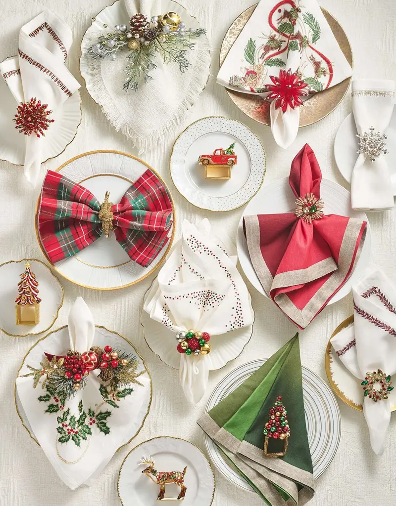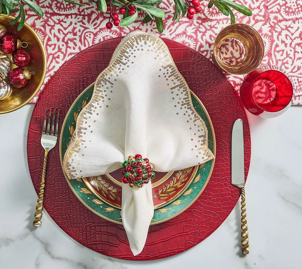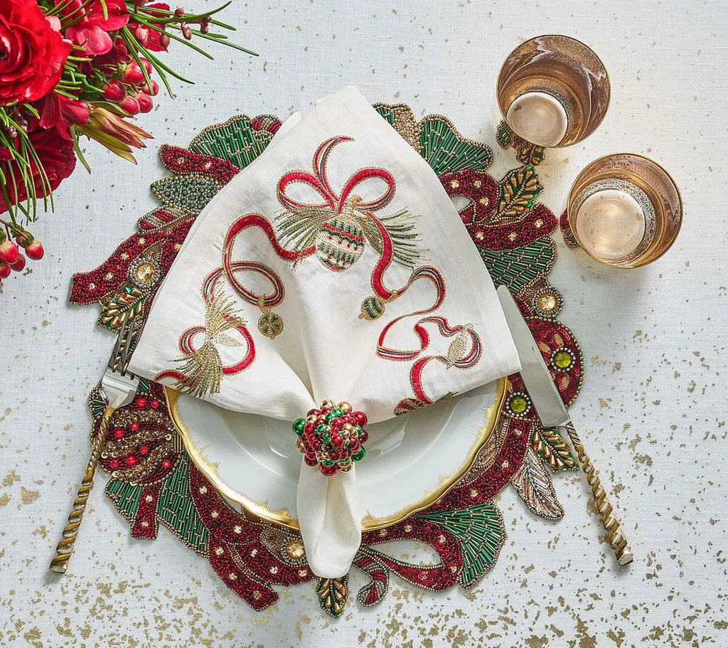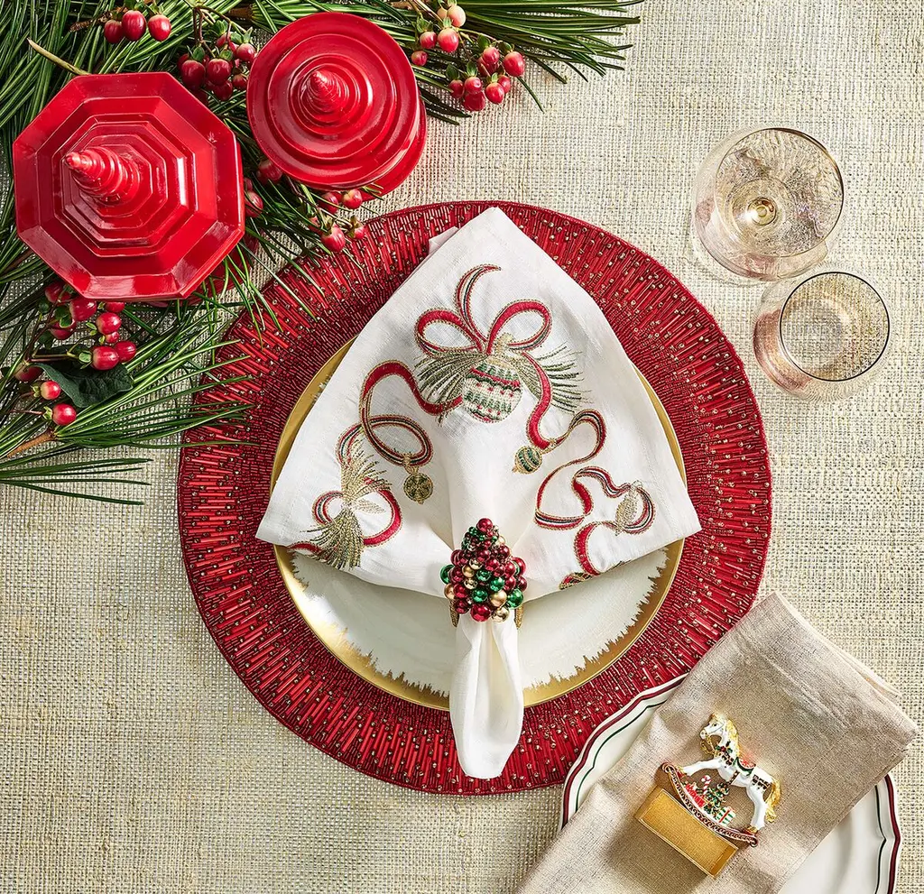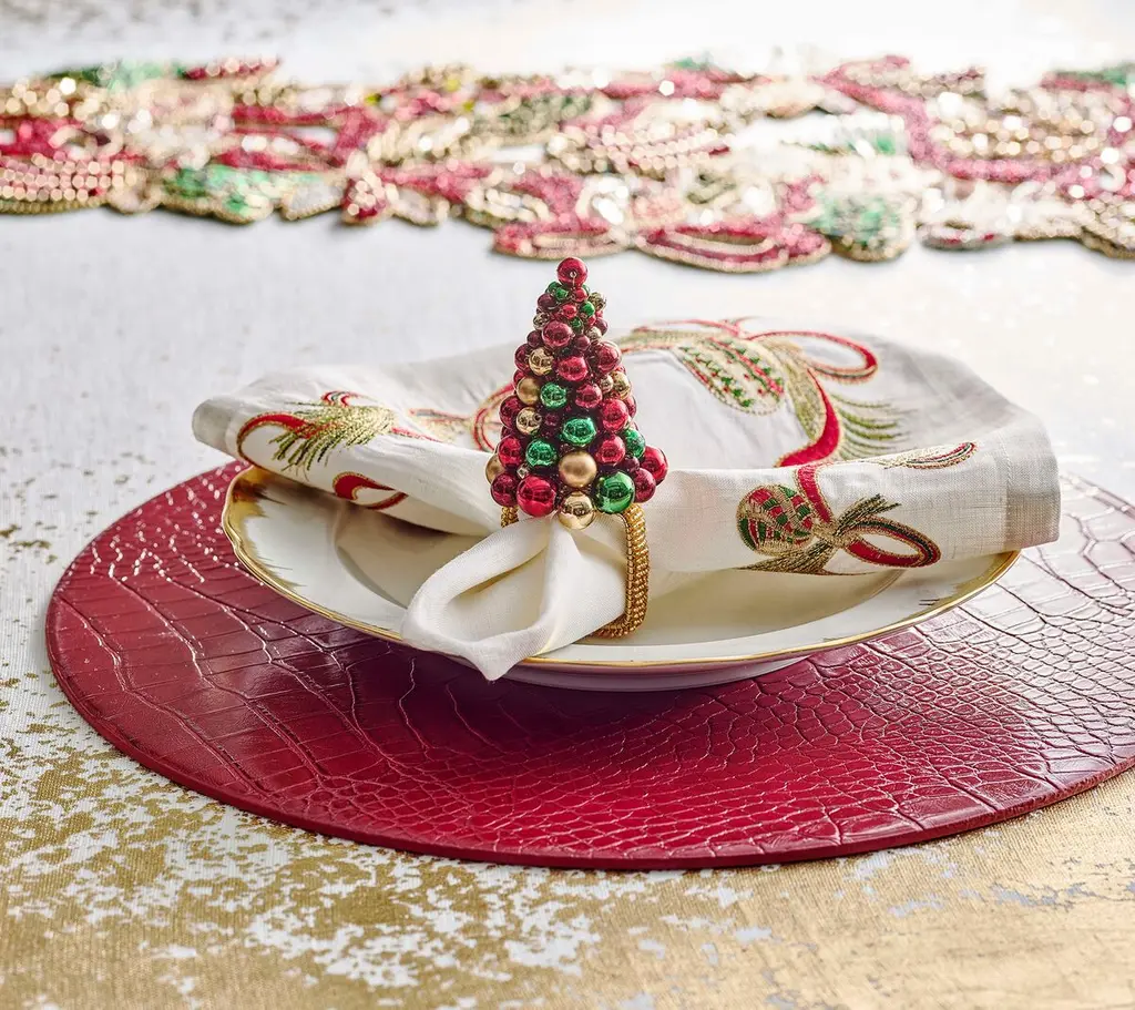 The classic Christmas-inspired Xmas Baubles Napkin Ring features a tree made from sparkling stacked globes. Various sizes of baubles are hand-strung and arranged to form a conical tree. The festive baubles sit atop a gold beaded, square ring.