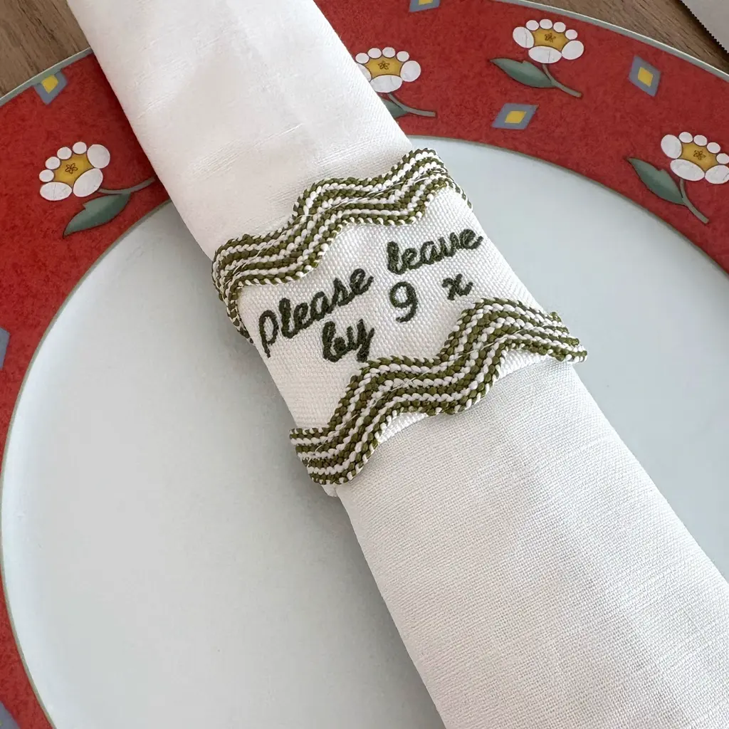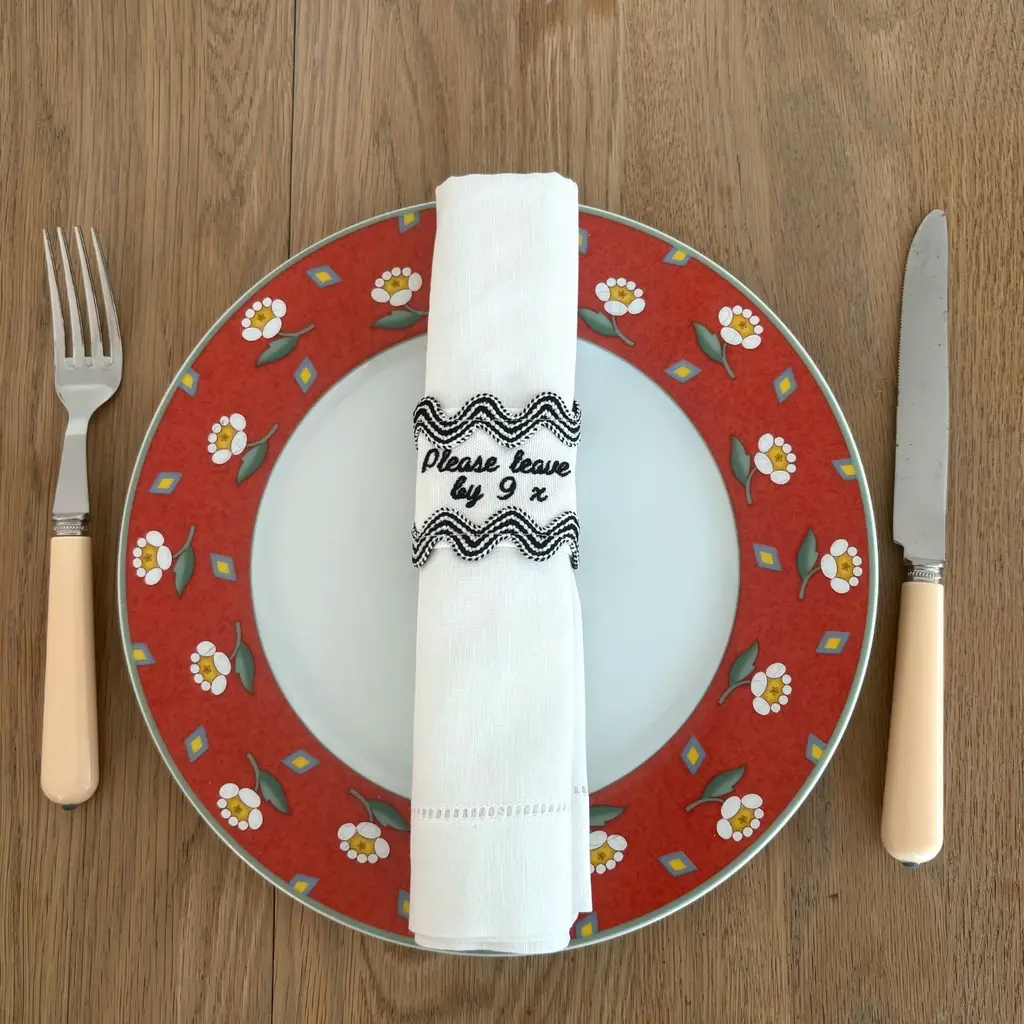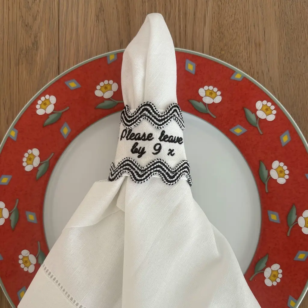 Our stunning napkin rings will add a memorable personal touch to your table. Each Napkin ring comes with a fun trim which features embroidered text. Please leave by nine. They will make your table setting look wonderful, be it a wedding, a birthday celebration, dinner party or any celebratory meal!Please enter which colour embroidery you would like.Set of 4These do up with a subtle popper on the back, making these easy to put on your napkin in. Napkins not included, only napkins rings.Personalised Wedding Napkin Rings, fabric Napkin Rings, Wedding Favours Party Decor, Placeholders.Suggestions: weddings, birthday parties, anniversaries,, balls, celebratory meals.