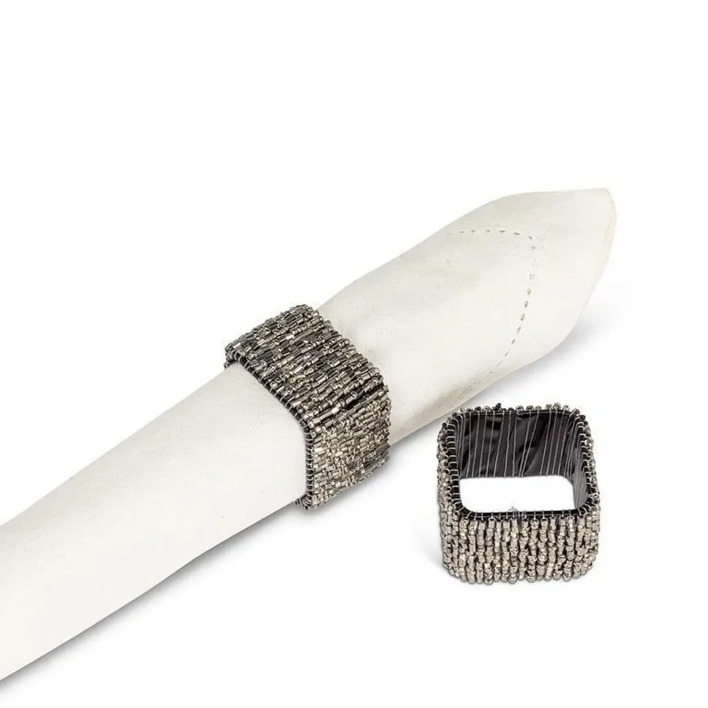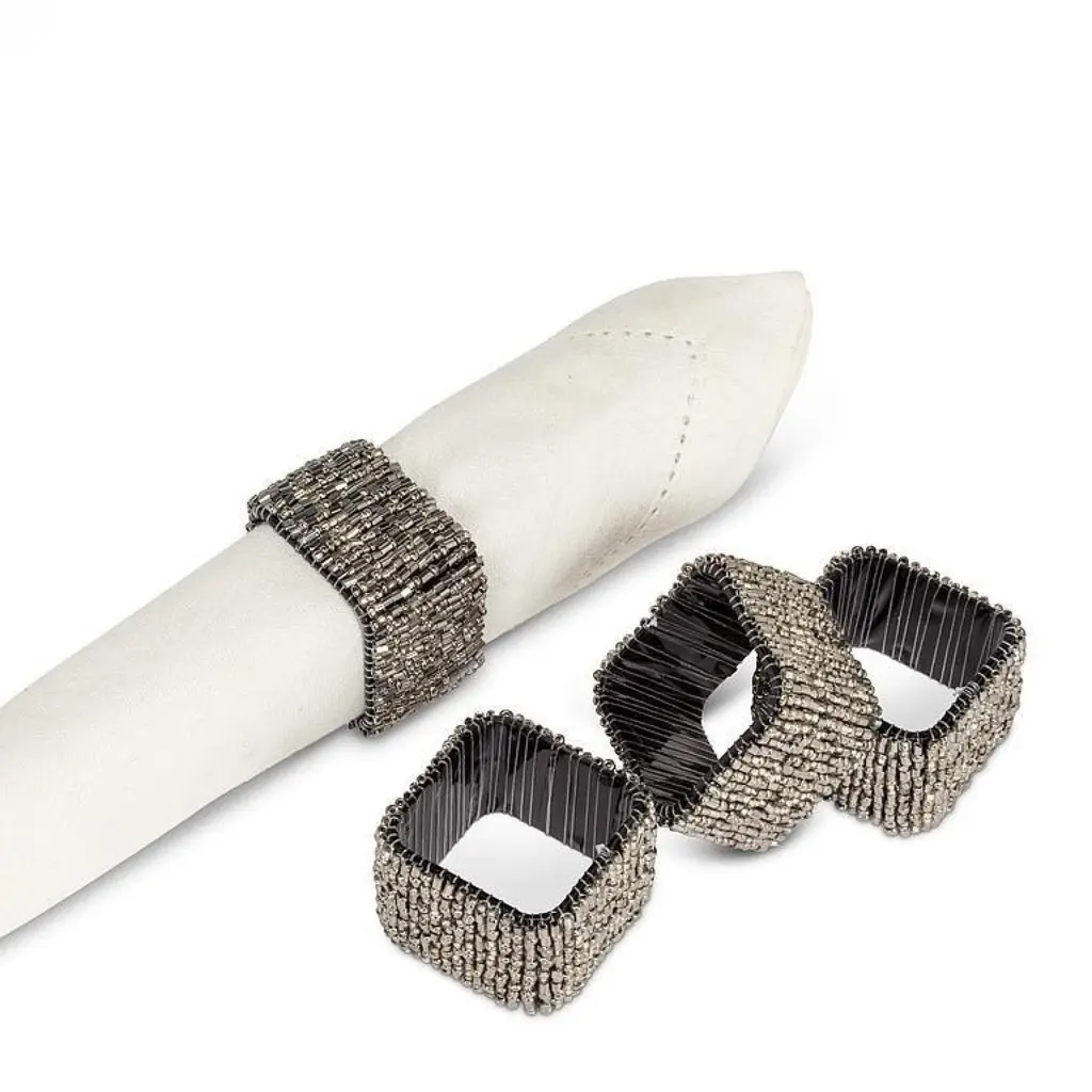 Elevate your table setting with our Set of 4 Beaded Napkin Rings, a chic and sophisticated addition to your dining decor. Crafted with precision, these napkin rings feature a square design covered with intricate beading, adding a touch of elegance to your table presentation. Made in India.