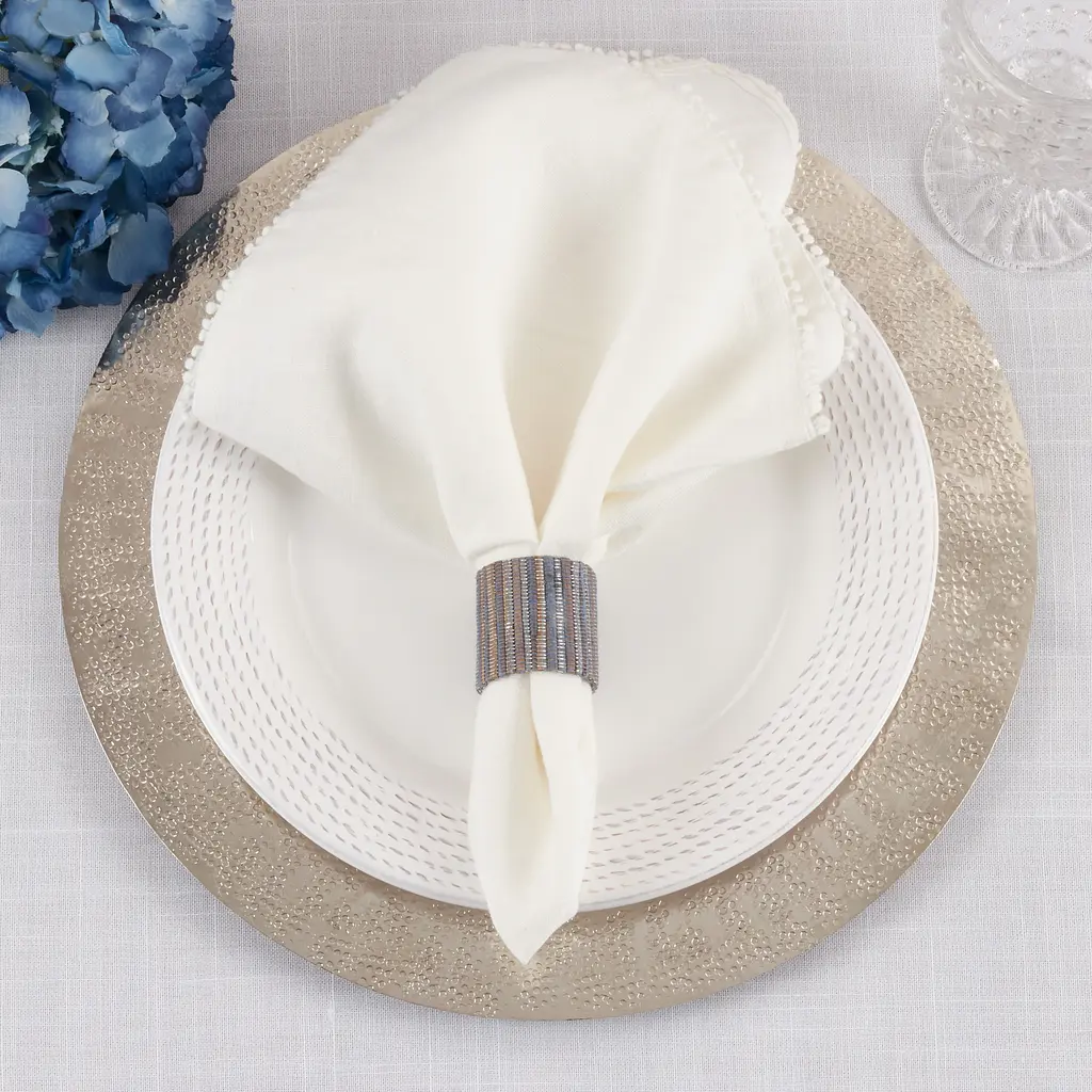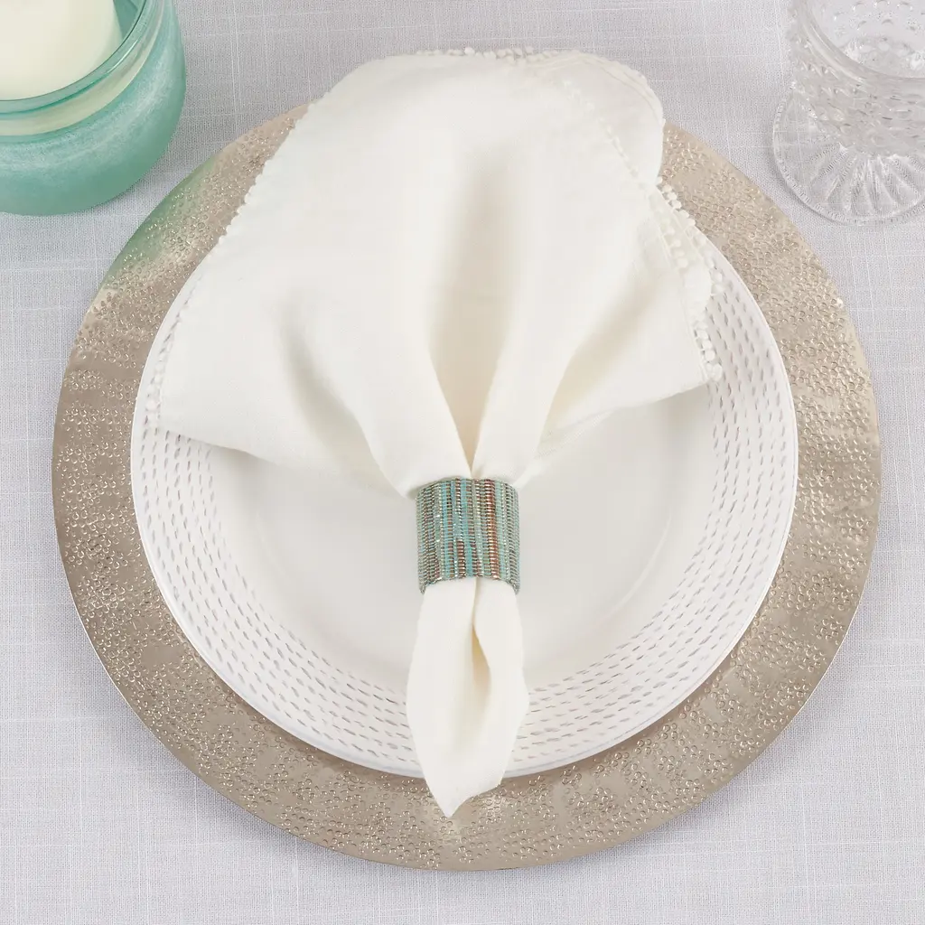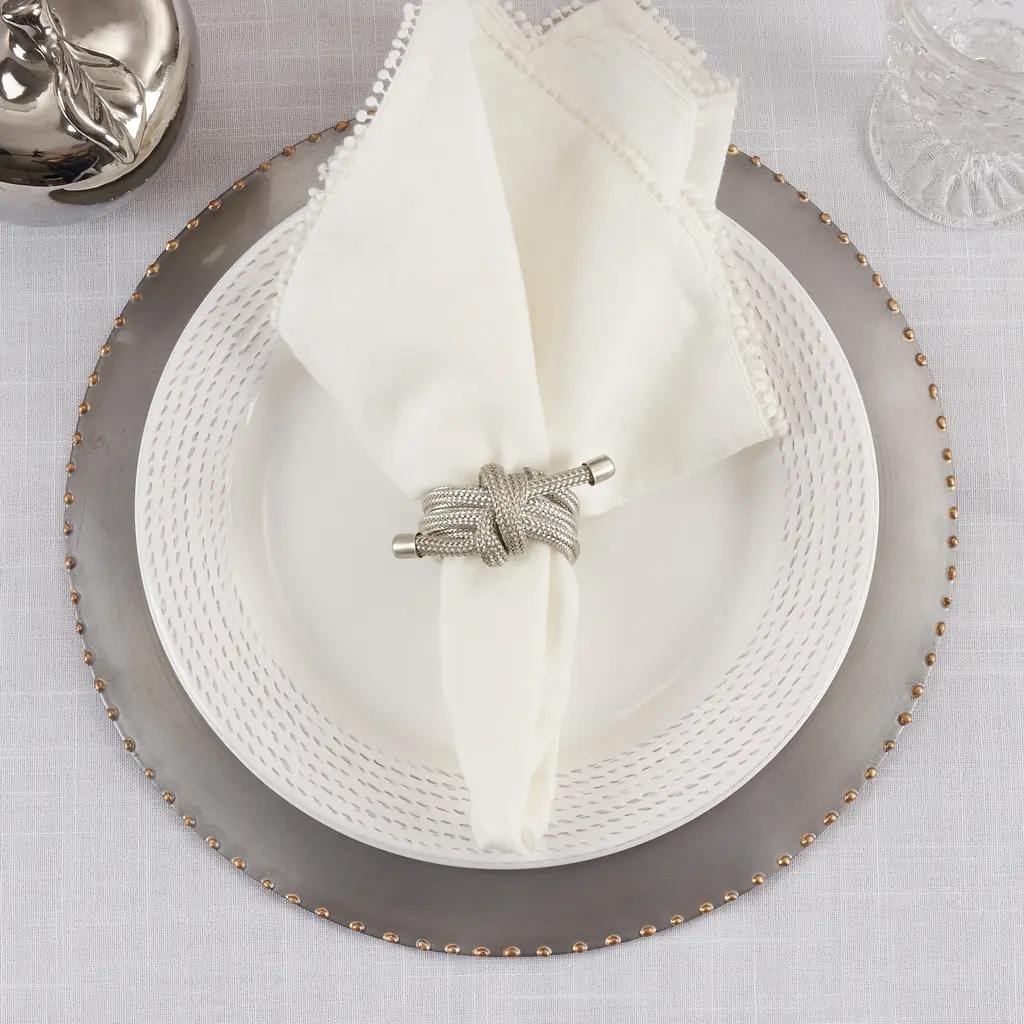 Perfect for casual dining and family get-togethers, the Shimmering Woven Nubby Napkin Rings are highly versatile and pair easily with a wide range of table linens and dinnerware. The set brings texture and depth to your table décor, adding the ideal touch to an informal setting. The napkin rings go well with linen table napkins.Features:
