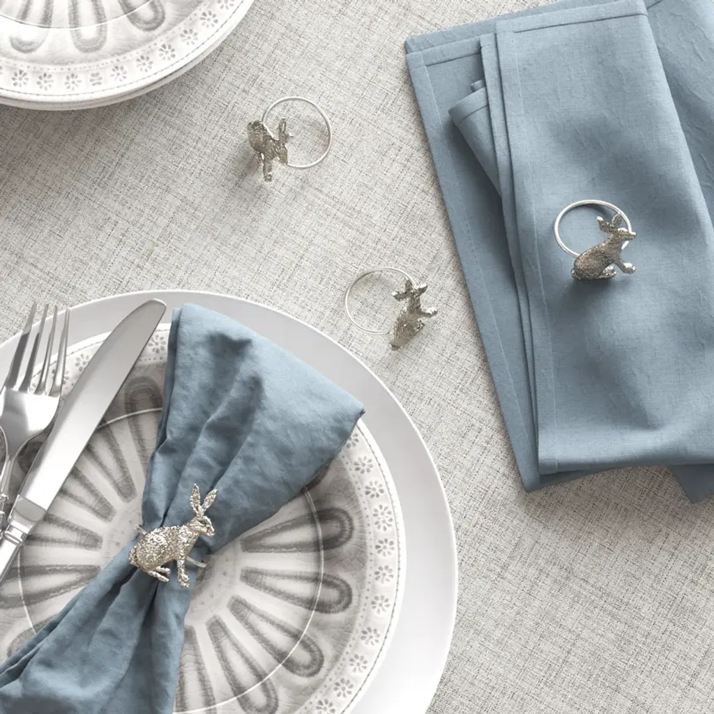 We are firm believers that if you like it, you should put a (napkin ring) on it. Add the final touch to your tabletop with this Silver Rabbit Napkin Ring, Set of 4. Add the finishing touch to your table setting. Designed to work with any tabletop decor, they are perfect for family dinners and any other special occasions. They are crafted to work with any standard size napkin and can be wiped clean with a damp cloth when needed. Don't let drab tableware distract your guests from a fabulous evening!