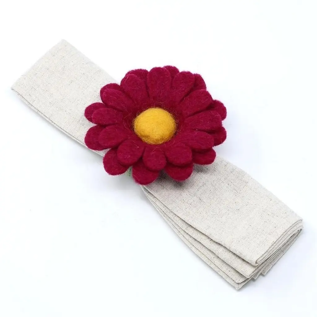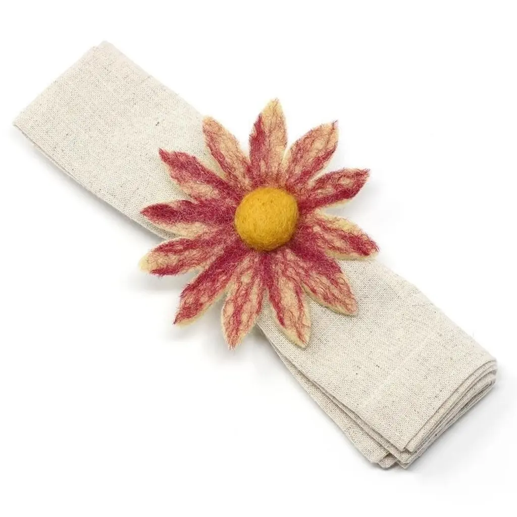 Set your table with unique bohemian style using this set of six handmade napkin rings. These napkin rings feature pretty little daisies and each one is made by women artisans in Nepal, and these napkin rings are eco-friendly, socially-responsible, Fair Trade products. Crafted of felted wool, these napkin rings are soft and long-lasting.Features:Set includes 6 decorative napkin ringsDaisy designHandcrafted by skilled women artisans in NepalSocially-responsible, eco-friendly, fair trade productMade of sustainably-sourced felted woolEach piece is highly textured and uniqueDyed with azo-free dyes2-inch ring openingThe handcrafted touch of artisan skill creates variations in color, size and design. If buying two of the same item, slight differences should be expected. Note: Color discrepancies may occur between this product and your computer screen.Imported