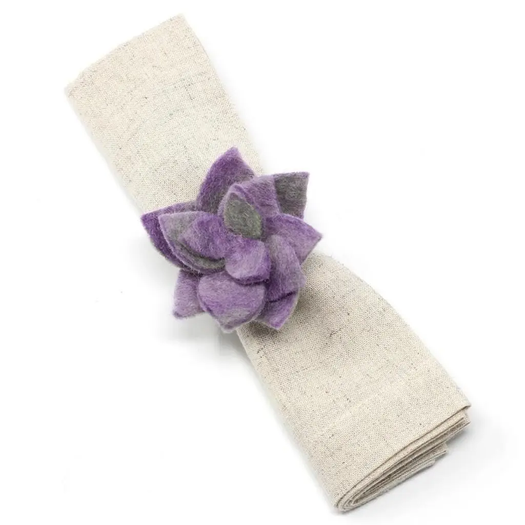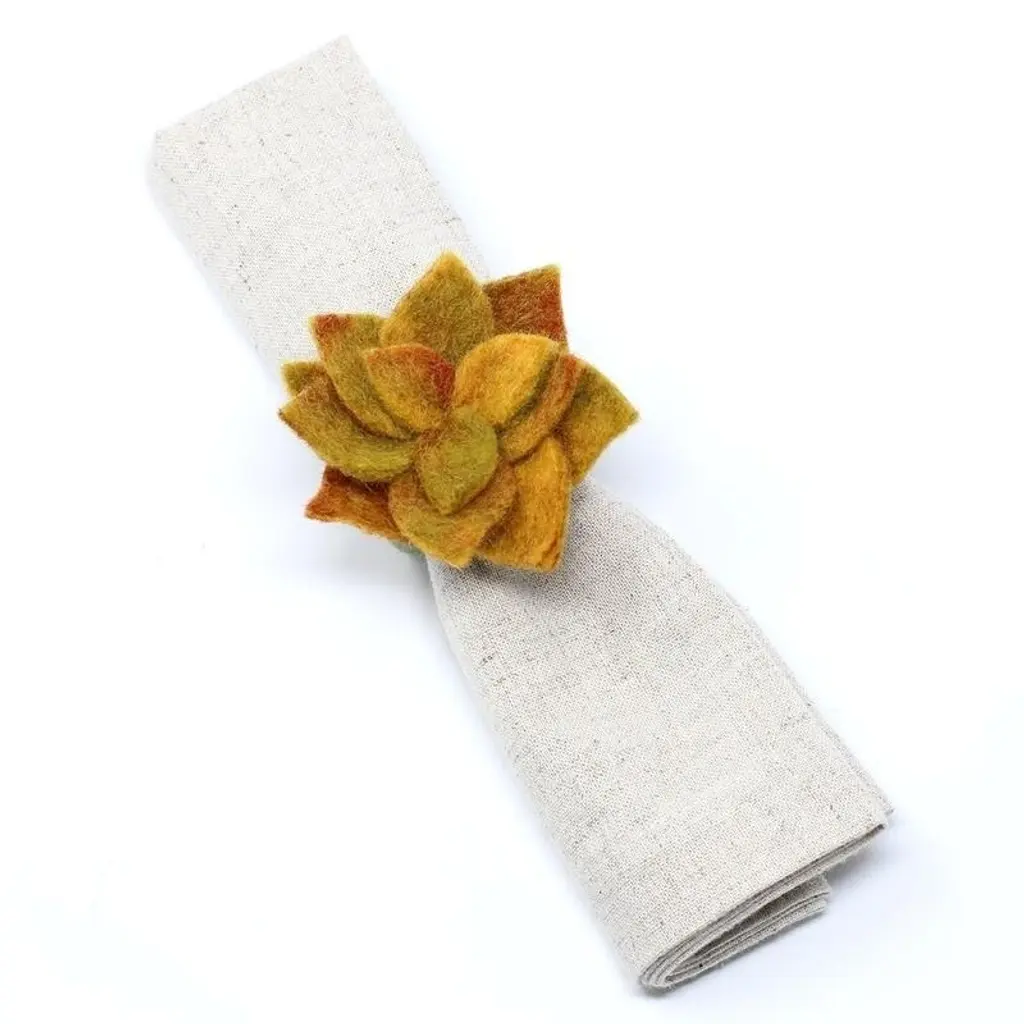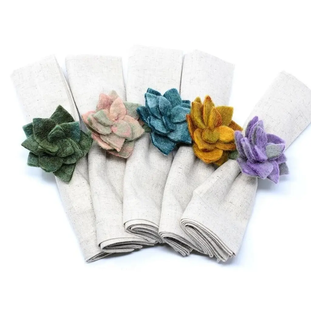 Set your table with unique bohemian style using this set of four handmade napkin rings, featuring little wool succulents. Each one is made by women artisans in Nepal, and these napkin rings are eco-friendly, socially-responsible, Fair Trade products. Crafted of felted wool, these napkin rings are soft and long-lasting.Features:Set includes 4 decorative napkin ringsSucculent designHandcrafted by skilled women artisans in NepalSocially-responsible, eco-friendly, fair trade productMade of sustainably-sourced felted woolEach piece is highly textured and uniqueDyed with azo-free dyes2-inch ring openingThe handcrafted touch of artisan skill creates variations in color, size and design. If buying two of the same item, slight differences should be expected. Note: Color discrepancies may occur between this product and your computer screen.Imported