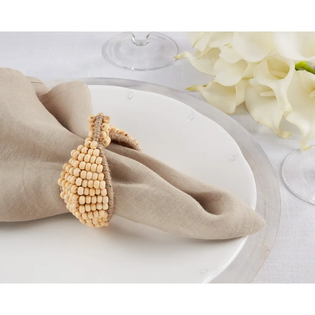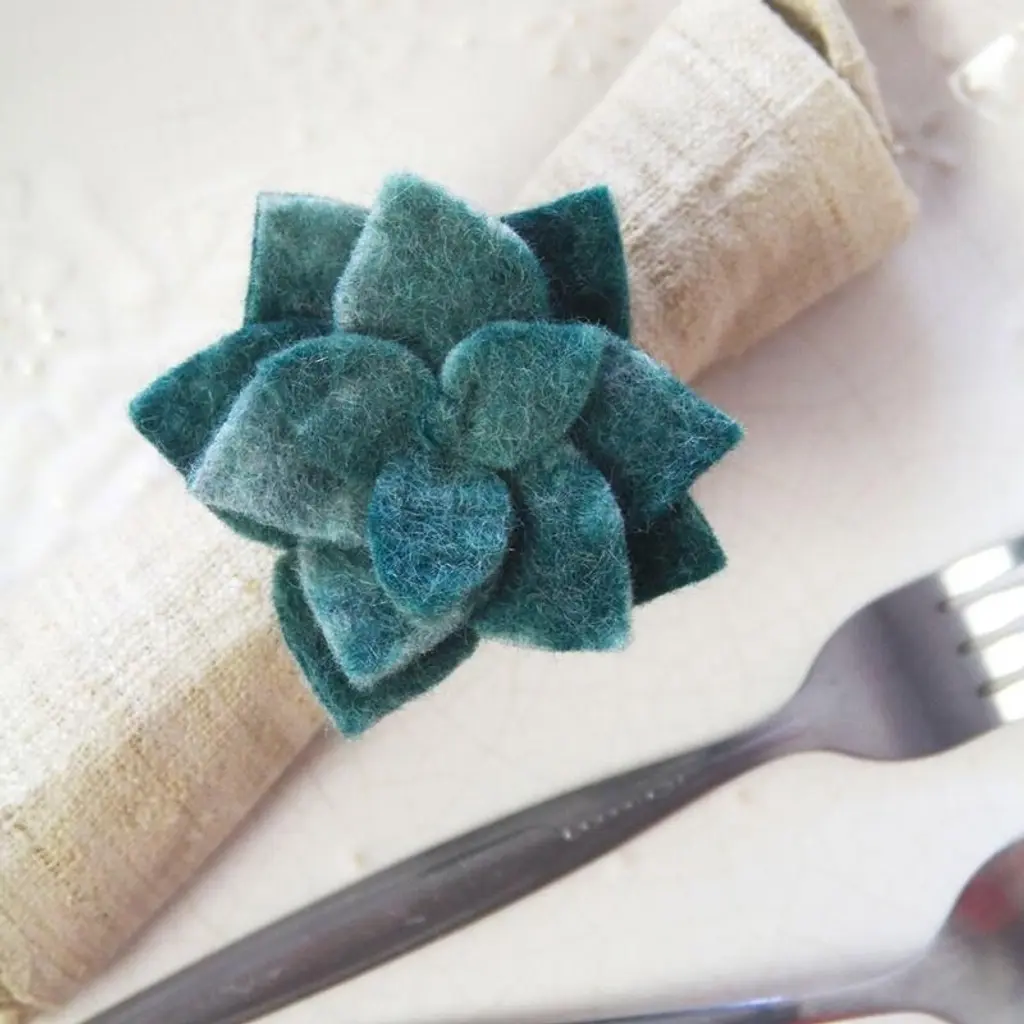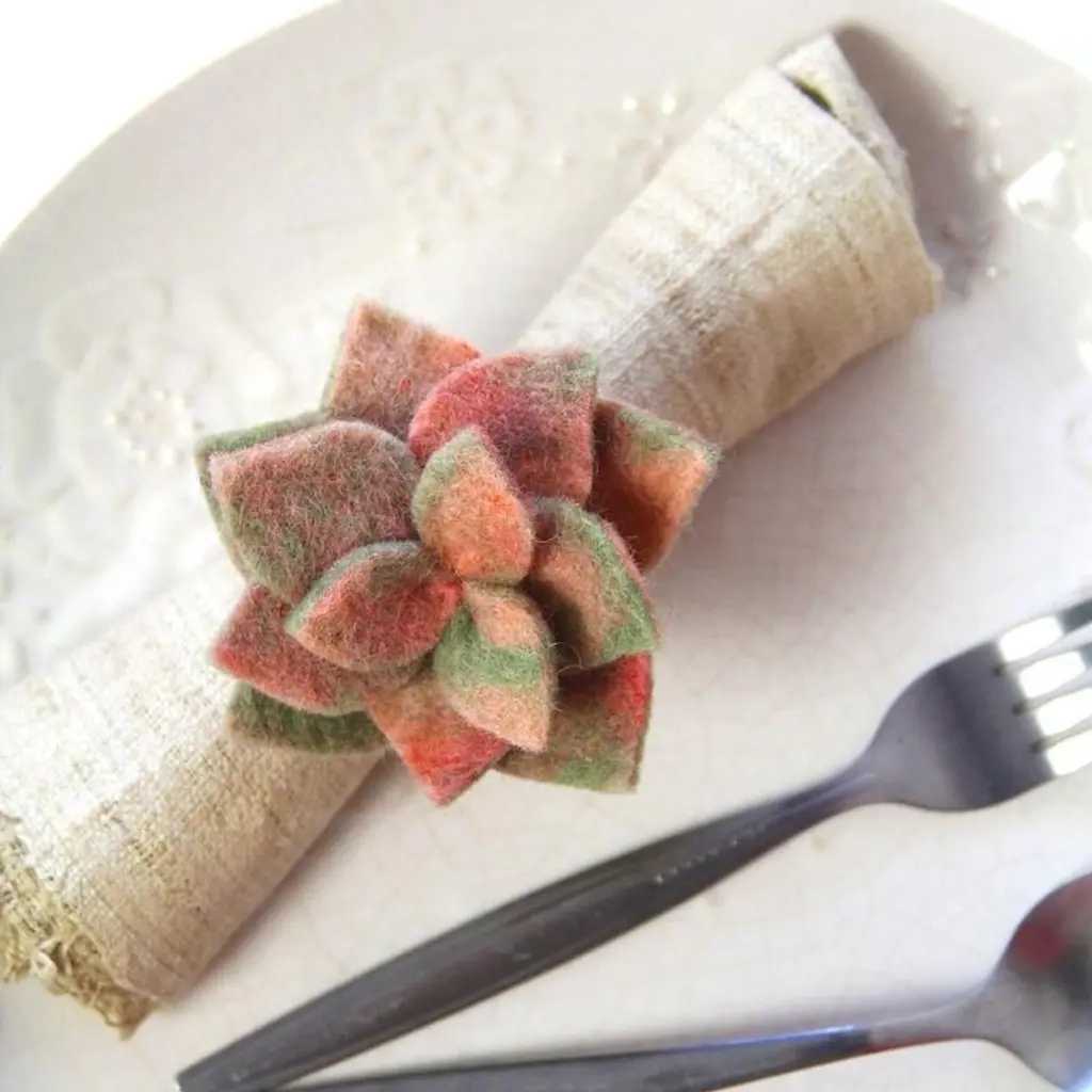 Set your table with unique bohemian style using this set of four handmade napkin rings, featuring little wool succulents. Each one is made by women artisans in Nepal, and these napkin rings are eco-friendly, socially-responsible, Fair Trade products. Crafted of felted wool, these napkin rings are soft and long-lasting.Features:Set includes 4 decorative napkin ringsSucculent designHandcrafted by skilled women artisans in NepalSocially-responsible, eco-friendly, fair trade productMade of sustainably-sourced felted woolEach piece is highly textured and uniqueDyed with azo-free dyes2-inch ring openingThe handcrafted touch of artisan skill creates variations in color, size and design. If buying two of the same item, slight differences should be expected. Note: Color discrepancies may occur between this product and your computer screen.Imported