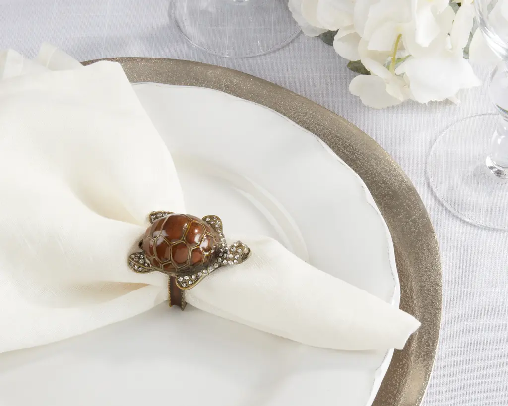 Whether you're trying to impress your guests or create a special family dinner, you can't go wrong with the Turtle Design Napkin Rings. Beautifully detailed and adorned with small stones, this set brings an elegant touch and a dazzling note to your table decor. It's the perfect accent to enhance your place settings.