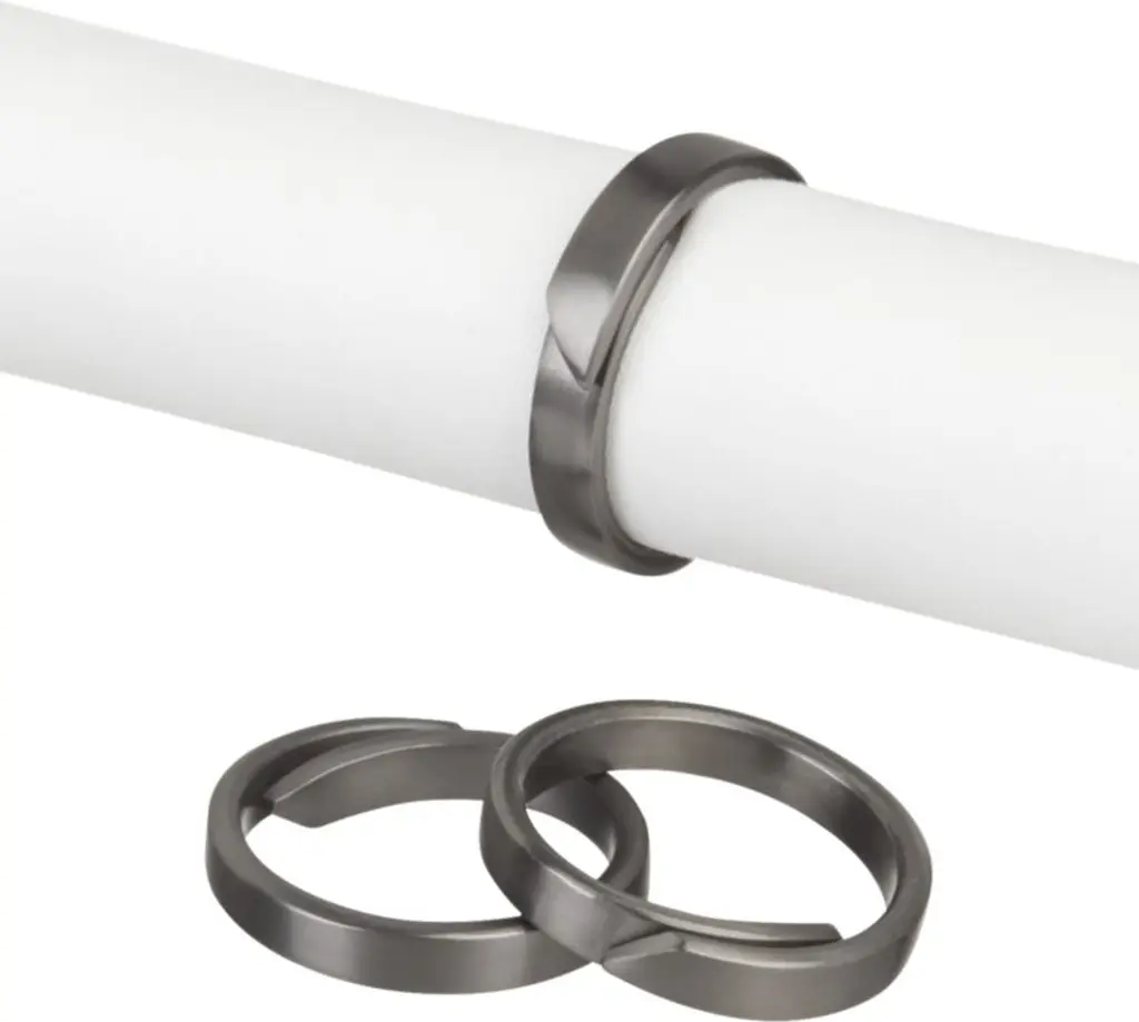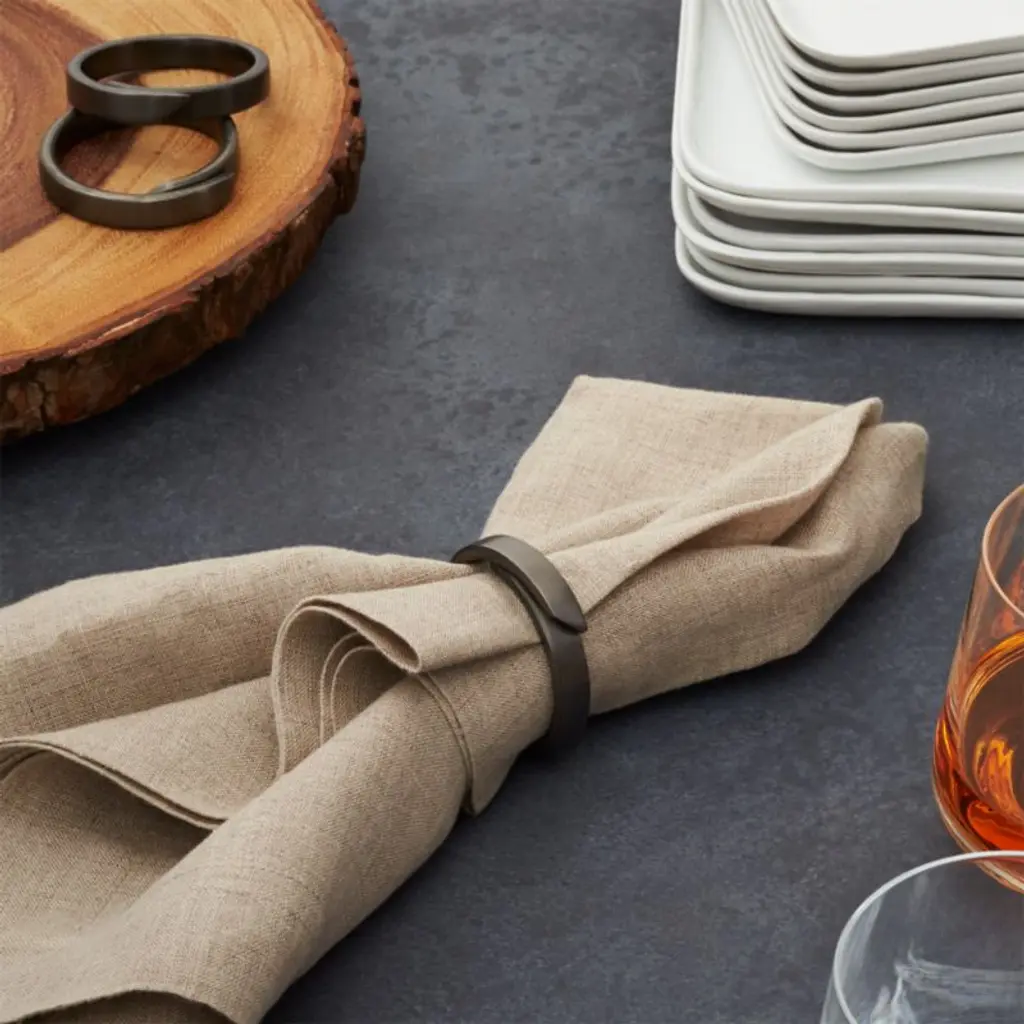 Pure stainless steel with a black gunmetal finish wraps gracefully around a cloth napkin, for a table accessory as striking and elegant as a handcrafted bangle. The darkly gleaming metal and streamlined design looks fantastic on minimal, industrial, rustic, farmhouse and formal tables. Mix and match this gunmetal napkin ring, a Crate and Barrel exclusive, with our coordinating stainless and copper Wrap napkin rings for a modern mixed-metal look.