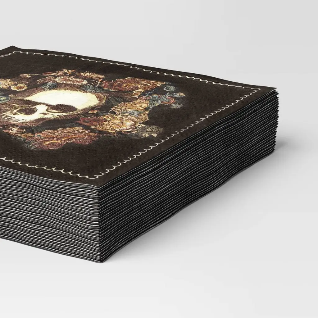 Get ready for hosting the Halloween party with the 20-Pack of Skull Beverage Napkins from Threshold™. This black beverage napkin pack features pumpkin and floral wreath print with a skull at the center for eerie appeal. Made of paper, the napkins are perfectly sized for using with drinks and appetizers.Threshold™: Looks like home, feels like you.