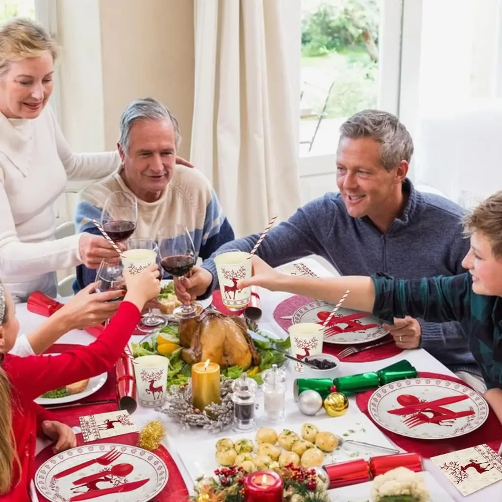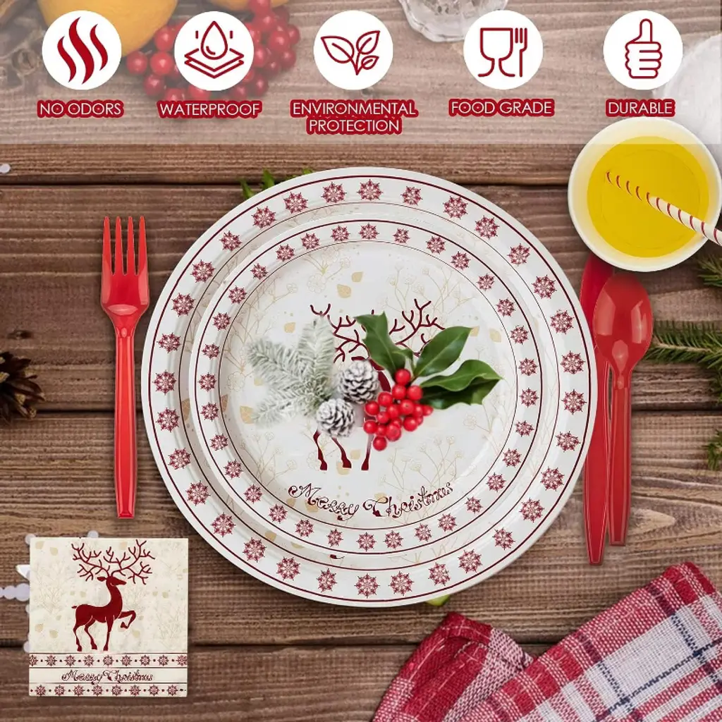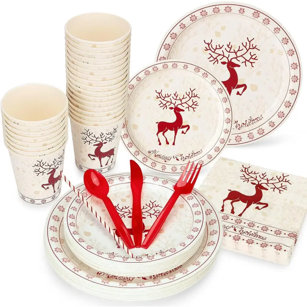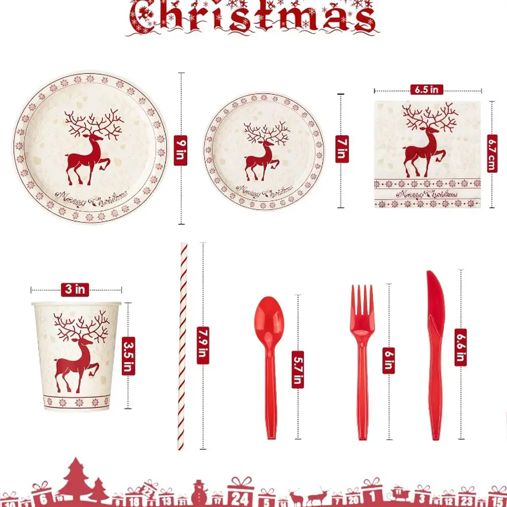 Specifications: Pattern: Snowflakes and Deer Number of Pieces: 215 Color: Red Package includes: 25 x Dinner Plates 25 x Dessert Plates 25 x Cups 40 x Napkins 25 x Knives 25 x Forks 25 x Spoons 25 x Straws Note: Upon receiving your order, please check that all included accessories are present. If you notice anything missing, don't hesitate to contact customer service right away.