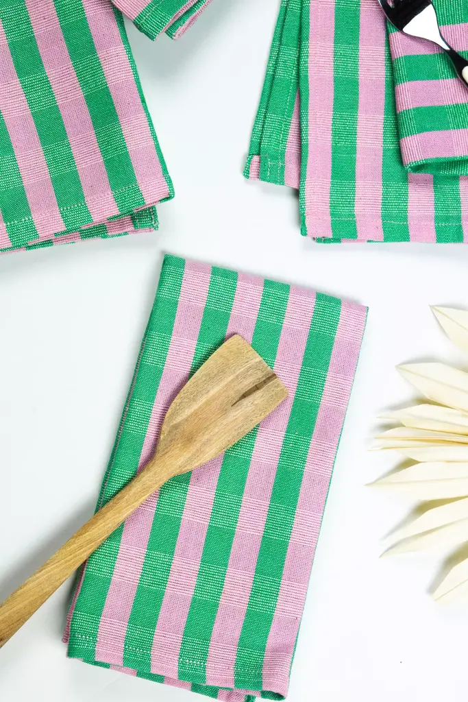 TheFlora napkin set is the perfect accent to add color and texture to anytable setting. Stripes of bubblegum pink and kelly green come together to together to create this brilliantly vibrant piece.Ethically handwoven by artisans in Xela, Guatemala.Archive New York is a line of handwoven, artisan made home decor products, founded in 2014 in Brooklyn, NY. The founder, Amira Marion, grew up in a home filled with Guatemalan textiles gathered by her parents in the 1970s. Her own designs emphasize a deep connection with Central American artisans, a commitment to Fair Trade practices, and the honoring of Maya culture, heritage and technique.* Set of four napkins* Handwoven cotton* Machine wash cold, tumble dry low* Imported#### *Dimensions** 18 x 18