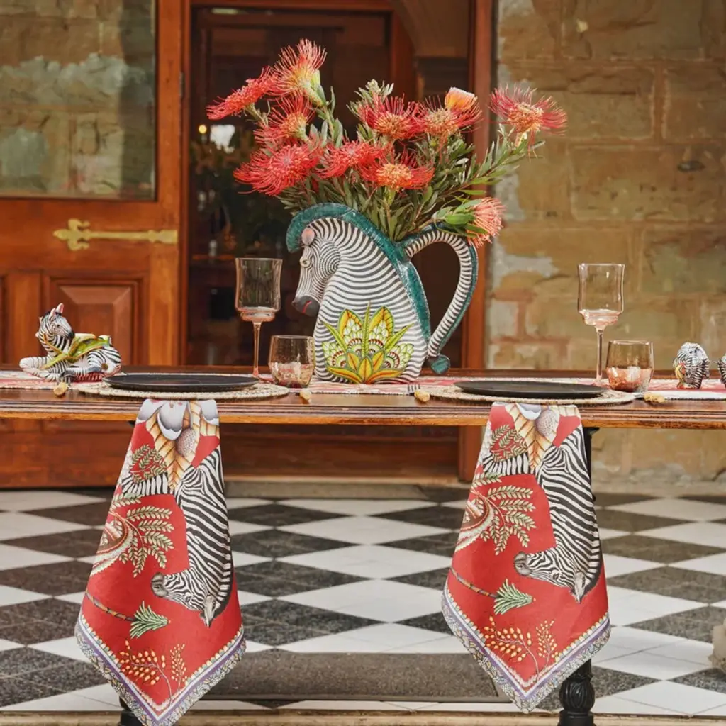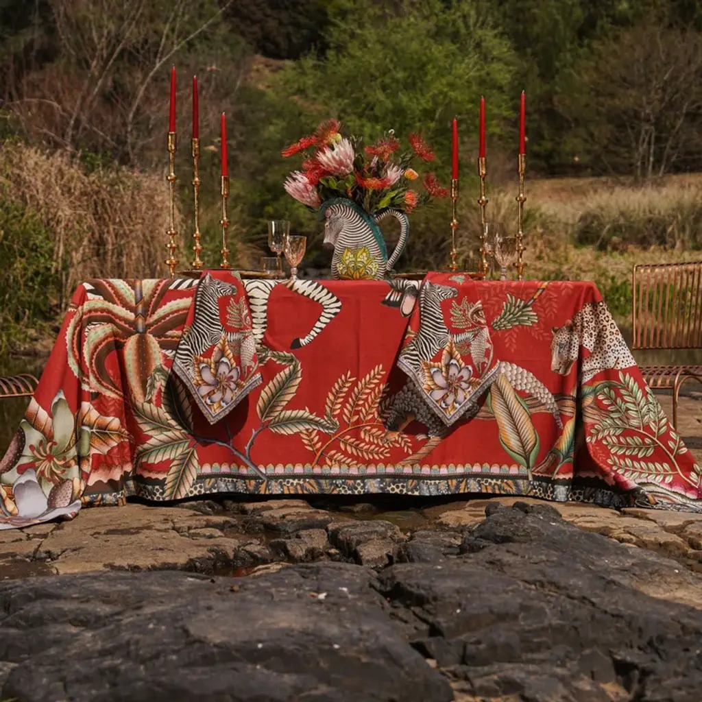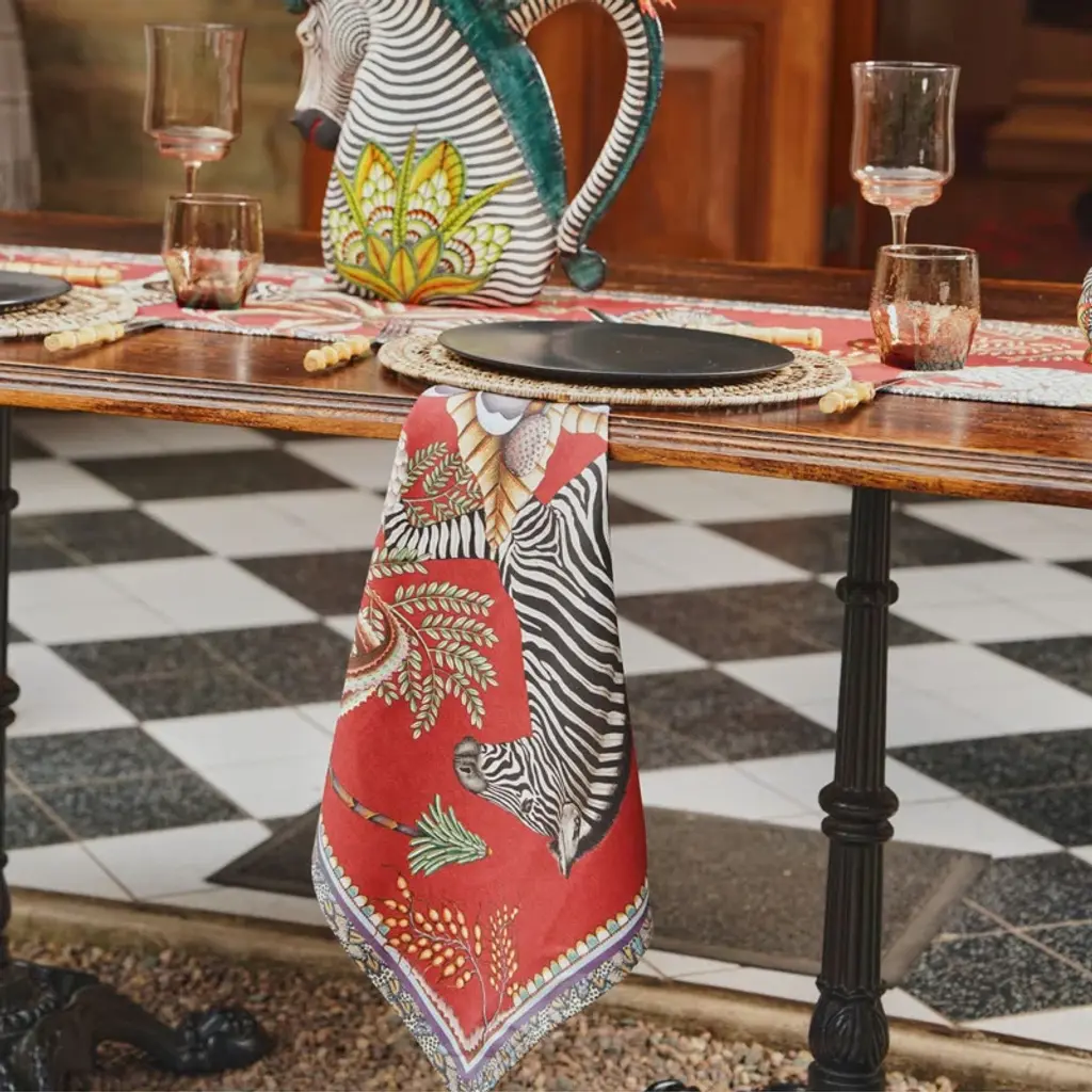 Designed in South Africa by Ardmore design, these napkins are crafted of cotton with a vibrant jungle-inspired pattern and coordinating edges. Featuring intricate artwork which depicts the wildlife of the Zambezi river basin, a leopard sits regally amongst passion flowers and lucky beans, which are associated with magic in Zulu culture. Sold in pairs, our collection of table napkins come in an array of patterns, prints, and colorways, ranging from neutral to wild and wonderful tones, don’t be afraid to mix and match. Every Ardmore napkin is individually cut and sewn in Johannesburg, South Africa.