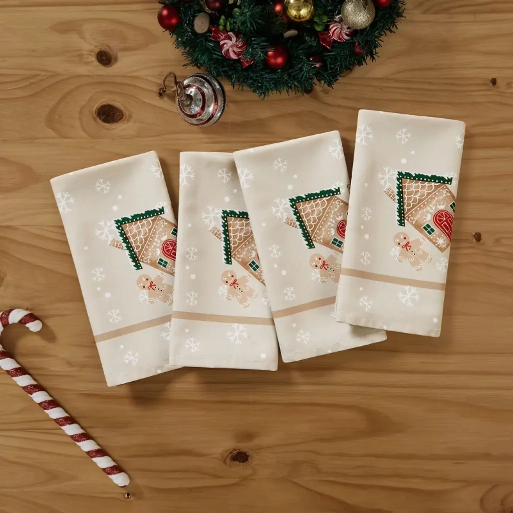 The Avanti Gingerbread Village Set of 4 18"x 18" Holiday Napkins features a house with a gingerbread man and Christmas tree in one corner. The linen-colored ground is covered with white dots and snowflakes and framed with a light brown border. Printed on 100% polyester for easy care.