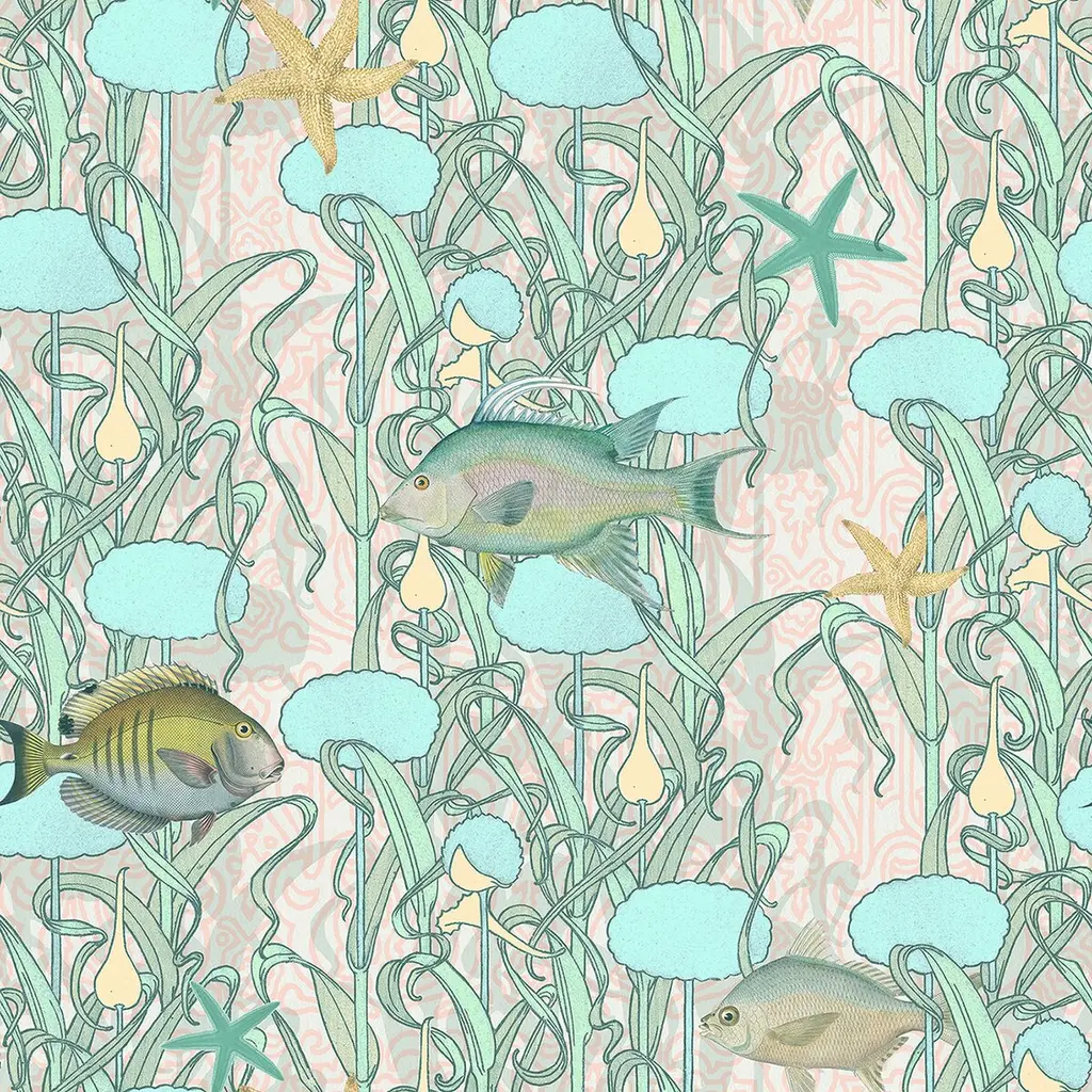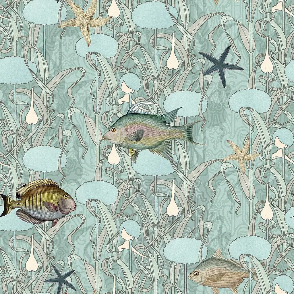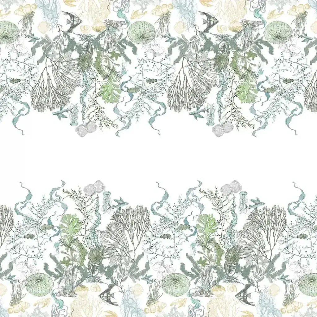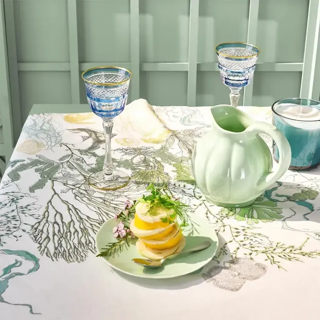 Tropical fish, coral, and seaweed float in water, brought to life in shades of white, green, blue, grey, and yellow on the Balade Marine Verde Table Linens by Garnier Thiebaut. This printed design was crafted from original artwork, hand-drawn by our in-house team of textile artisans and designers in France. Combining the best qualities of cotton and linen, this fabric blend seamlessly enhances the table with its effortless appearance while providing durability and long-lasting performance. Since 1870, Garnier-Thiebaut has created classic and jacquard linens in the quintessential French style. Their linens have been used by the Four Seasons George V in Paris, the Mandarin Oriental Hotel in Geneva, The Ritz Carlton, Manama (Bahrain), Le Meridien Bora Bora, the Four Seasons Hotel, New York, and The French Laundry in Yountville.