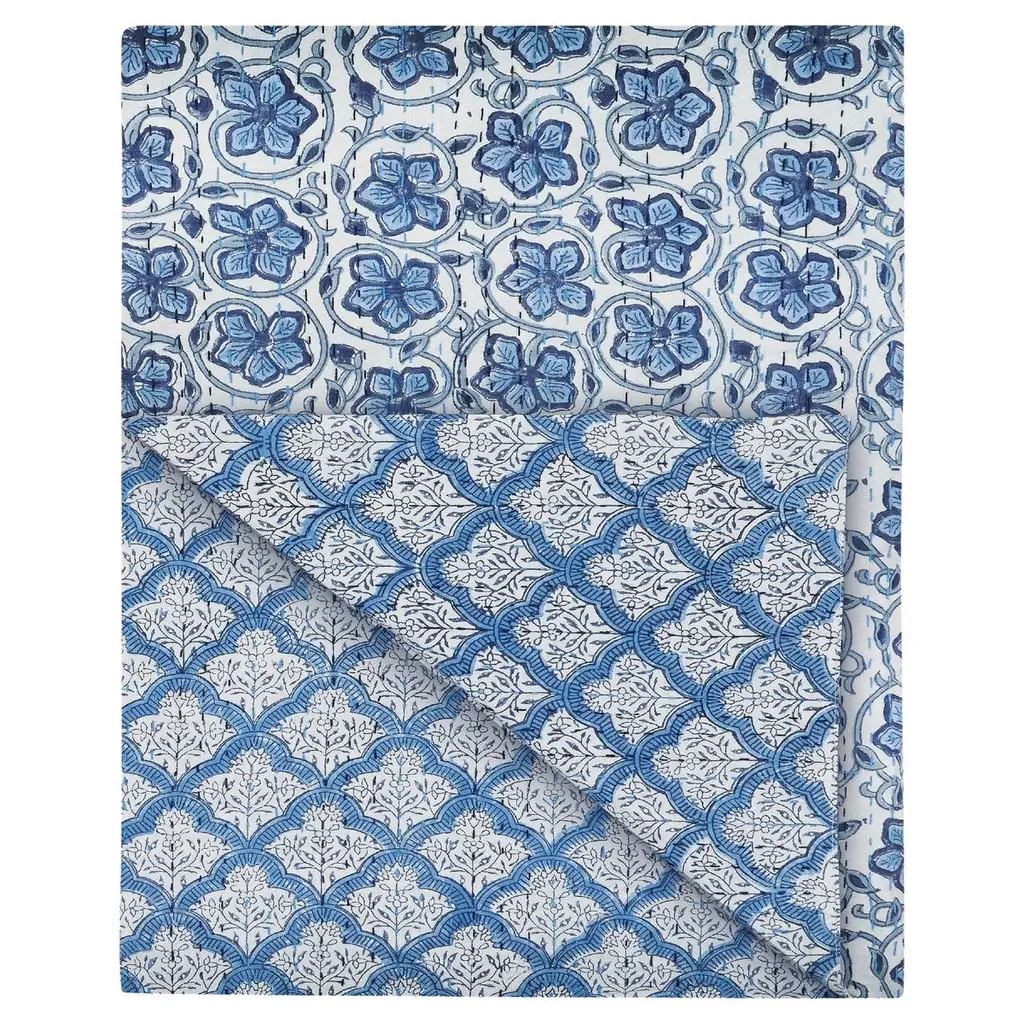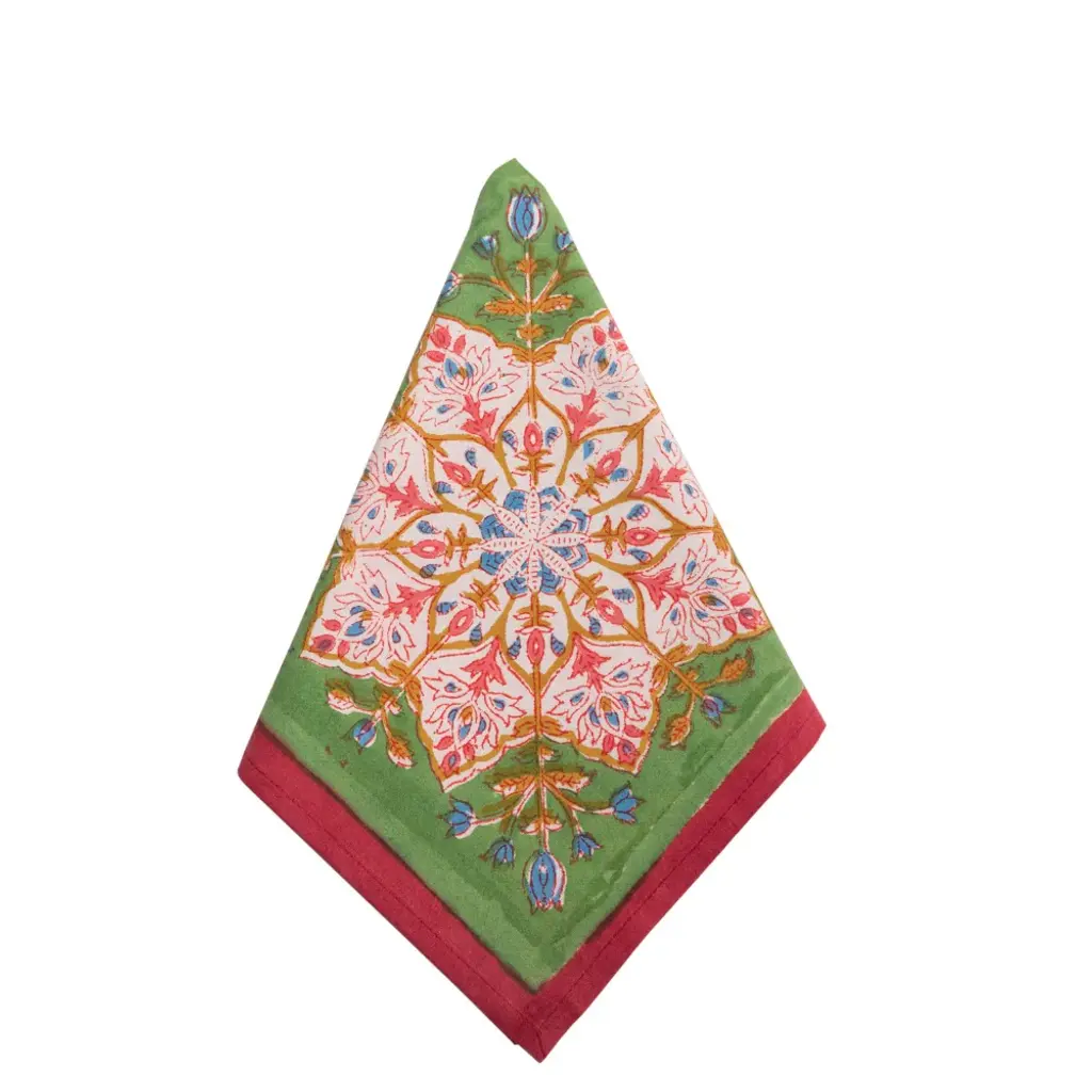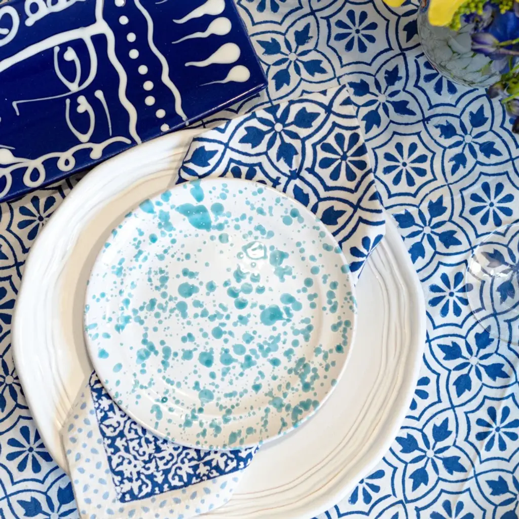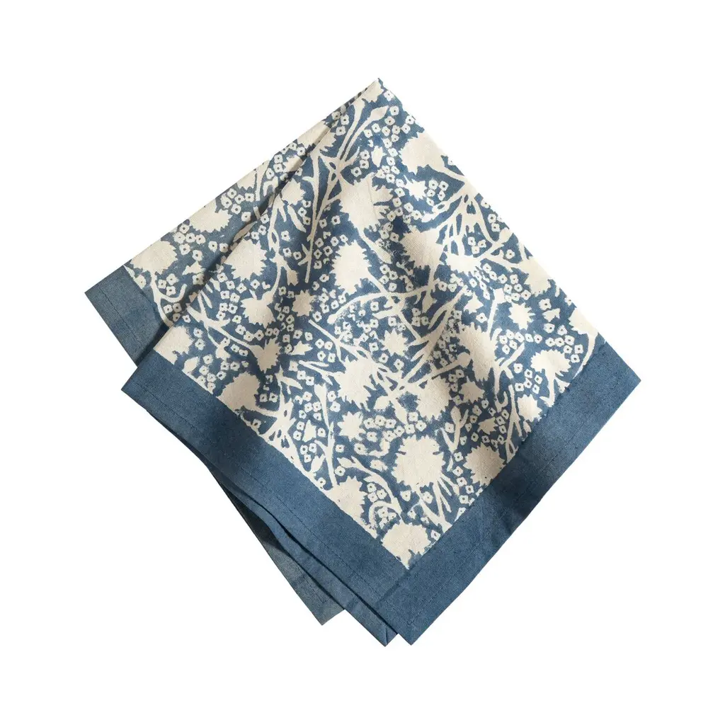Suitable for all occasions, the navy and white hand-blocked cotton napkins present with a boho vibe for a relaxed table setting. The border dot pattern, in light blue, adds fun definition.