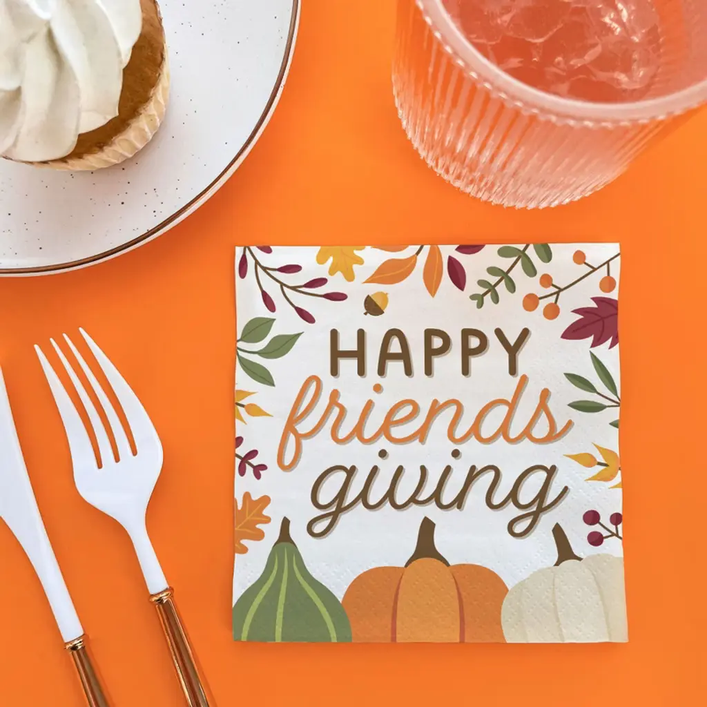 Thanksgiving Napkins: Add a festive touch to your Thanksgiving table with Fall Friends Thanksgiving Napkins! These disposable napkins are perfect for Thanksgiving dinners, Friendsgiving gatherings, or fall-themed celebrations. Easy Fall Table Decor: From pumpkin pie to mashed potatoes, these Thanksgiving napkins keep things tidy while dressing up your place settings. They're a simple way to add a polished, seasonal look to your table with zero extra effort. Perfect for Fall Party Planning: Hosting a cozy Friendsgiving? Planning a big family feast or a casual football-filled Thanksgiving? These Fall Friends Thanksgiving napkins are great for every kind of autumn celebration. Premium Paper Napkins: Each napkin is printed on white, soft, 3-ply paper with a one-sided full-color design that's absorbent, vibrant, and durable enough for all your Thanksgiving snacks, drinks, and dessert table moments. Made in the USA: Fall Friends Thanksgiving Napkins are designed and manufactured at our Wisconsin facility using materials that are proudly Made in the USA.