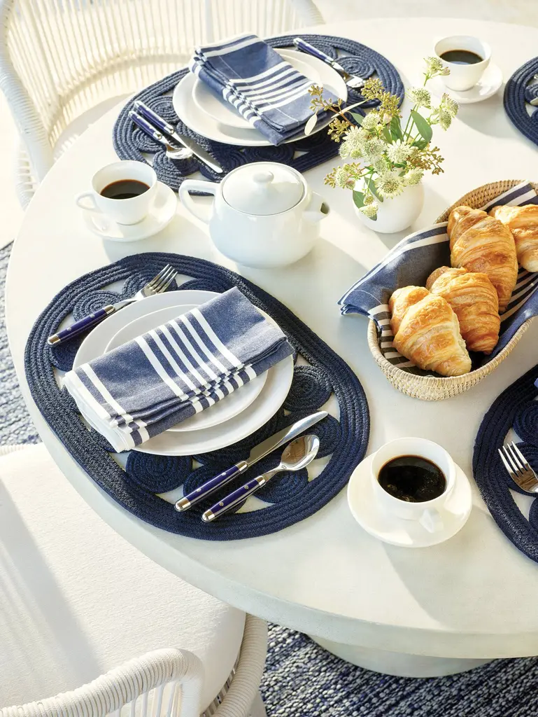 Happy colors and chic stripes give our oversized, handwoven, softly laundered cotton napkins their tabletop brightening style. In Coral, Indigo, French blue, or Platinum with cream-colored woven stripes. Generously sized for total lap protection, they also double as tea towels, so consider buying extra sets to coordinate your kitchen and table. Sold as a set of four.