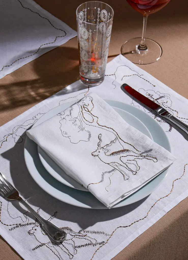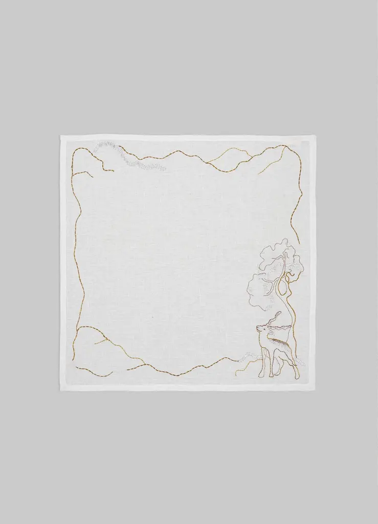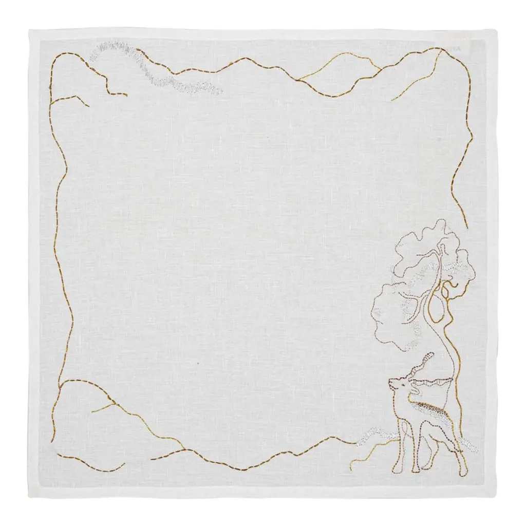 Blackbuck Dreams Hand Embroidered White & Gold Napkin, Viya by Vikram GoyalIn "The Book of Dreams”, the 17th century Indian manuscript, a glimpse of the Blackbuck signifies an excellent omen, a harbinger of positivity, and good fortune. Believed to be a mythical animal of flight, this elusive creature embodies purity, piety and prosperity. Here, hand-embroidered blackbucks in various graceful poses leap across a forest scene, symbolising propitious blessings for the user.Hand embroidered napkin in cotton linen. Handmade in India.Product DetailsMaterial: Cotton LinenSize: 18"W x 18"L 45.7 W x 45.7 L cmWeight: 0.04 0.088 lbsNumber of Pieces: 1 NapkinSKU: VTN451This product has been handcrafted by local artisans. As such, slight variations are a testament to the unique character of a piece made by hand.Country of Origin: India