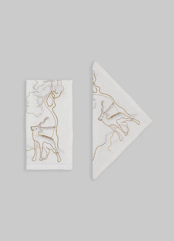 Blackbuck Dreams Hand Embroidered White & Gold Napkin, Viya By Vikram Goyal