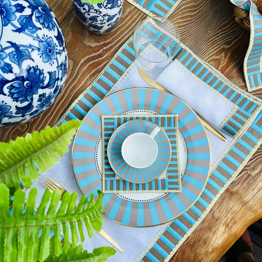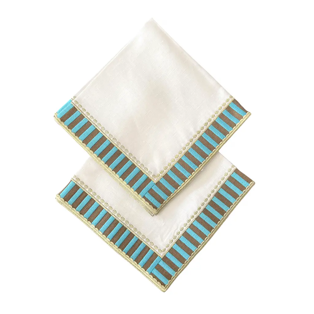 Elevate your dining experience with these 100% linen cloth napkins, finished with elegant gold cording for a modern yet timeless touch. Designed to perfectly complement blue tableware, they bring both sophistication and charm to your table setting. Ideal for formal dinners, casual gatherings, or festive occasions. Size: 16'' x 16'' (40x40 cm). Available in sets of 2 Matching cocktail napkins and placemats also available to complete the look.