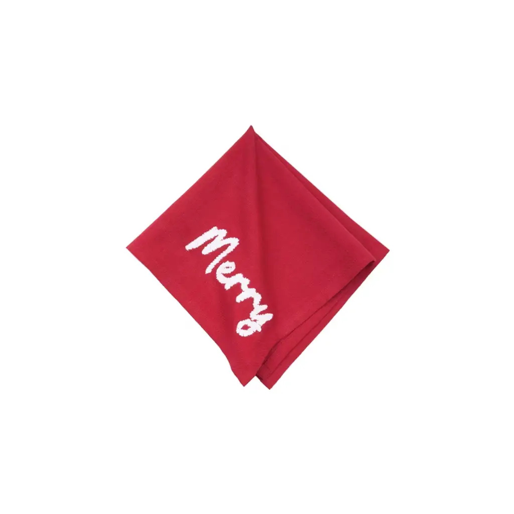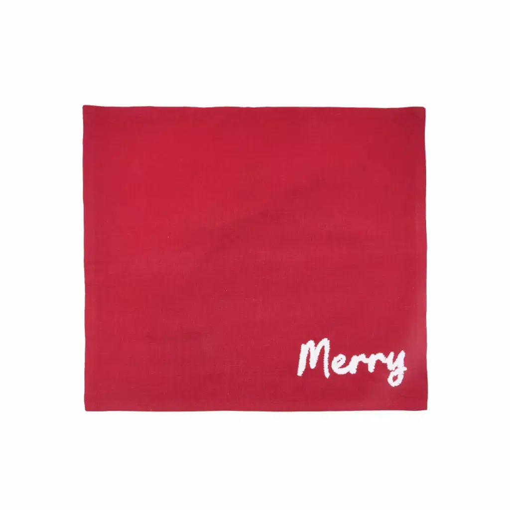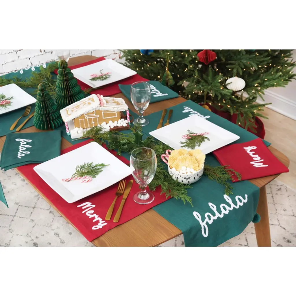 Tabletops get a festive makeover with carol & frank s cheerful holiday linens. The simplicity and minimalist of the solid woven cotton placemats, runners, and napkins feature joyful holiday sayings hand-embroidered in chunky yarn text atop solid cotton slub backgrounds. These casual table linens are ideal for holiday gatherings throughout the season.