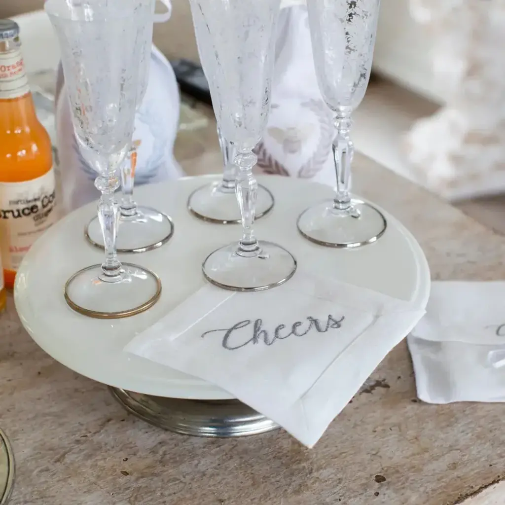 This beautiful set of four 100% European linen cocktail napkins will make your table look elegant and classy. Each cocktail size napkin is embroidered with a lovely "Cheers" and measures 6" x 6". Combine with table runners, squares and napkins for the perfect look.